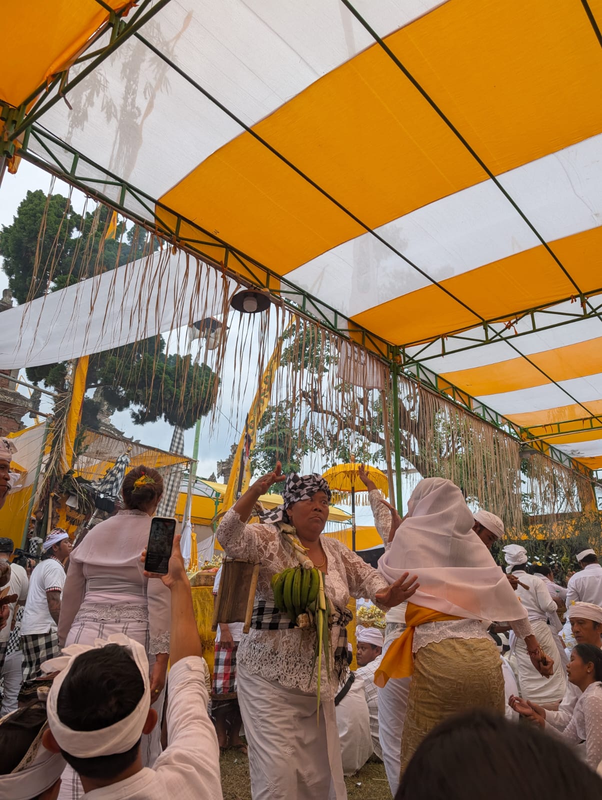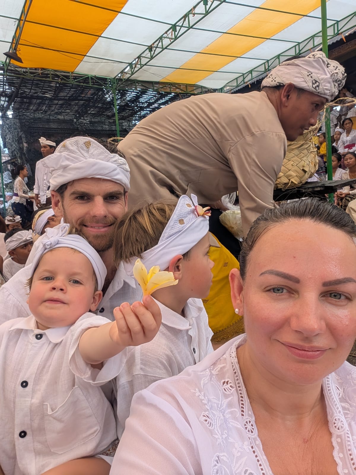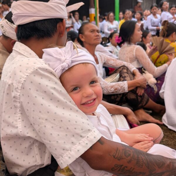 Samedi, nous avons Ă©tĂ© invitĂ©s Ă  participer au dernier jour de la cĂ©lĂ©bration des rĂ©coltes. Nous avons remis nos beaux costumes de cĂ©rĂ©monie et nous sommes partis au temple juste avant 14h. Il faisait trĂšs trĂšs chaud. DĂ©dĂ© nous a montrĂ© un carrĂ© d’herbe un peu boueuse et nous a expliquĂ© que nous devions enlever nos tongues et nous asseoir dessus. Il y avait tellement de monde que la dame devant moi Ă©tait initialement assise sur mes pieds. Et avec le sarong trĂšs serrĂ©, pas facile de s’asseoir en tailleur! La cĂ©rĂ©monie Ă©tait un mĂ©lange du Haka NĂ©o-zĂ©landais et du film l’Exorciste avec des danses (transes?), des cris, des yeux exorbitĂ©s, des langues tirĂ©es, une jeune fille qui mange de l’encens allumĂ©, des femmes qui s’Ă©vanouissent, le prĂȘtre qui vient leur jeter de l’eau dessus et elles, qui se rĂ©veillent en hurlant et en “vomissant” de l’air. DĂ©paysement total. Ensuite un groupe d’hommes ramĂšnent un Ă©norme cochon qui va ĂȘtre sacrifiĂ©. Il est 15h, nous sommes en nage. Au bout de quelques minutes, le cochon se libĂšre et se met Ă  courir frĂ©nĂ©tiquement dans le temple, tout le monde se lĂšve en criant et la foule avance et recule au rythme du cochon. Nous dĂ©cidons de partir Ă  15h30. Nous passons devant le cochon et ses gardiens proposent aux enfants de le voir (toujours vivant!). LĂ©onard et Lilio s’approchent et lĂ , le cochon fait un bond pour se lever et se met Ă  courir vers eux. Lilio a eu peur, moi aussi. Les enfants ont trouvĂ© cette journĂ©e plus intĂ©ressante que la prĂ©cĂ©dente. Nous avons fini l’aprĂšs-midi dans la piscine Ă©videmment 🙂