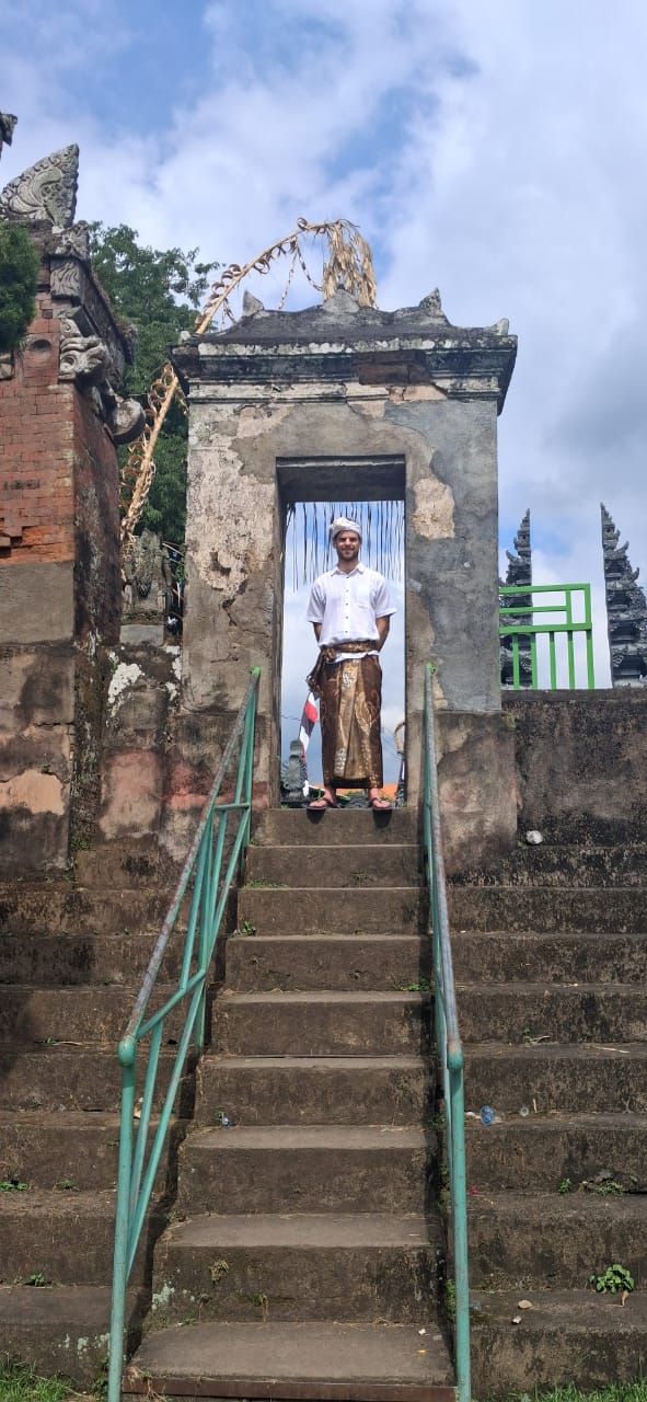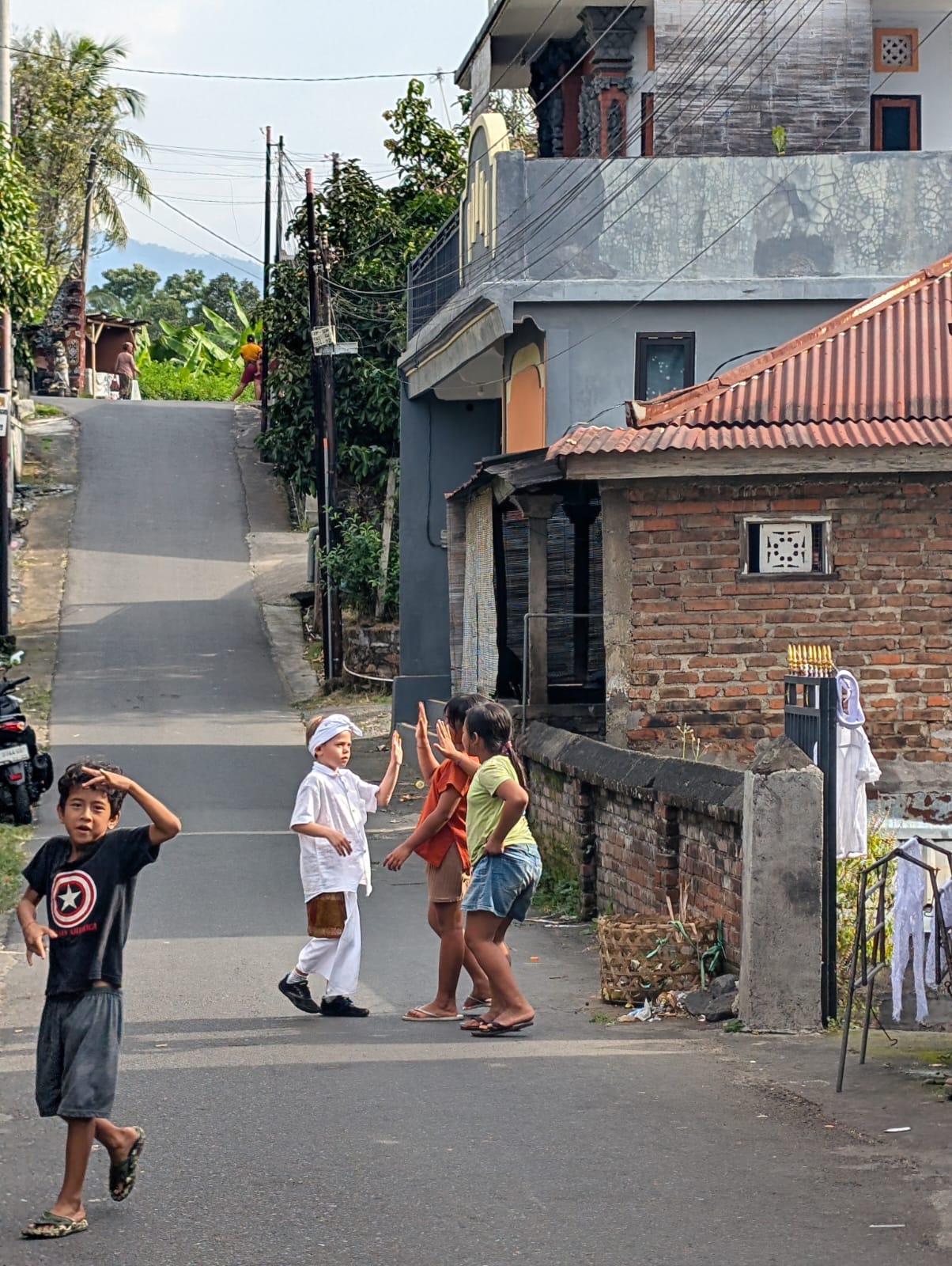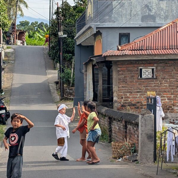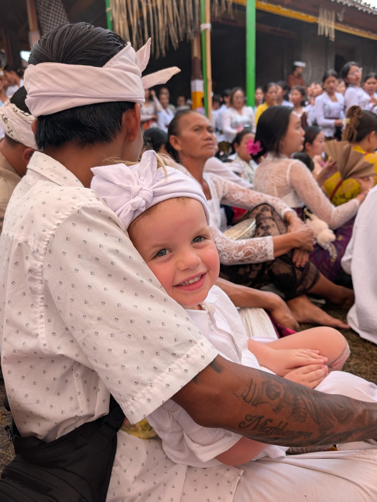 Samedi, nous avons Ă©tĂ© invitĂ©s Ă  participer au dernier jour de la cĂ©lĂ©bration des rĂ©coltes. Nous avons remis nos beaux costumes de cĂ©rĂ©monie et nous sommes partis au temple juste avant 14h. Il faisait trĂšs trĂšs chaud. DĂ©dĂ© nous a montrĂ© un carrĂ© d’herbe un peu boueuse et nous a expliquĂ© que nous devions enlever nos tongues et nous asseoir dessus. Il y avait tellement de monde que la dame devant moi Ă©tait initialement assise sur mes pieds. Et avec le sarong trĂšs serrĂ©, pas facile de s’asseoir en tailleur! La cĂ©rĂ©monie Ă©tait un mĂ©lange du Haka NĂ©o-zĂ©landais et du film l’Exorciste avec des danses (transes?), des cris, des yeux exorbitĂ©s, des langues tirĂ©es, une jeune fille qui mange de l’encens allumĂ©, des femmes qui s’Ă©vanouissent, le prĂȘtre qui vient leur jeter de l’eau dessus et elles, qui se rĂ©veillent en hurlant et en “vomissant” de l’air. DĂ©paysement total. Ensuite un groupe d’hommes ramĂšnent un Ă©norme cochon qui va ĂȘtre sacrifiĂ©. Il est 15h, nous sommes en nage. Au bout de quelques minutes, le cochon se libĂšre et se met Ă  courir frĂ©nĂ©tiquement dans le temple, tout le monde se lĂšve en criant et la foule avance et recule au rythme du cochon. Nous dĂ©cidons de partir Ă  15h30. Nous passons devant le cochon et ses gardiens proposent aux enfants de le voir (toujours vivant!). LĂ©onard et Lilio s’approchent et lĂ , le cochon fait un bond pour se lever et se met Ă  courir vers eux. Lilio a eu peur, moi aussi. Les enfants ont trouvĂ© cette journĂ©e plus intĂ©ressante que la prĂ©cĂ©dente. Nous avons fini l’aprĂšs-midi dans la piscine Ă©videmment 🙂