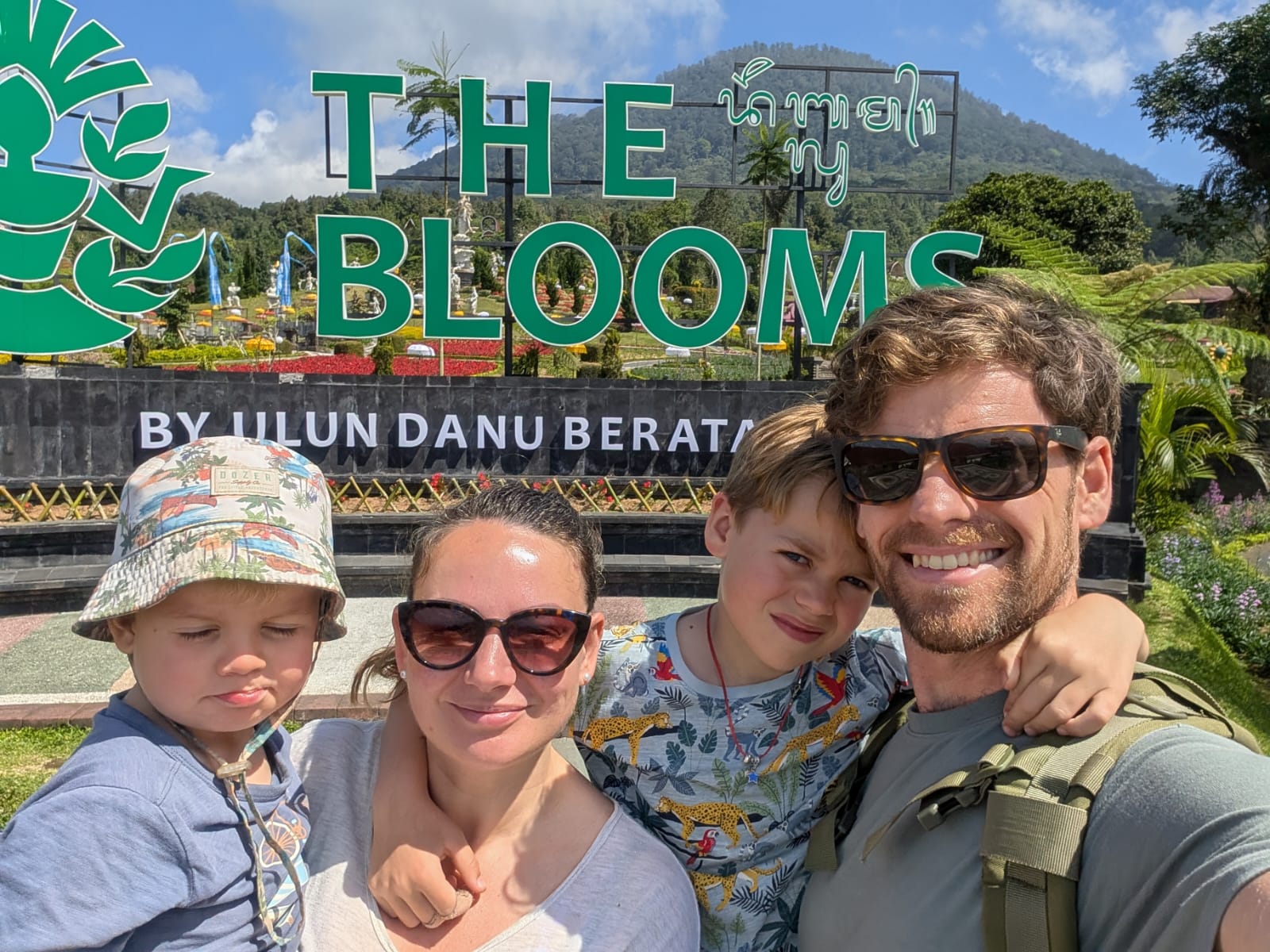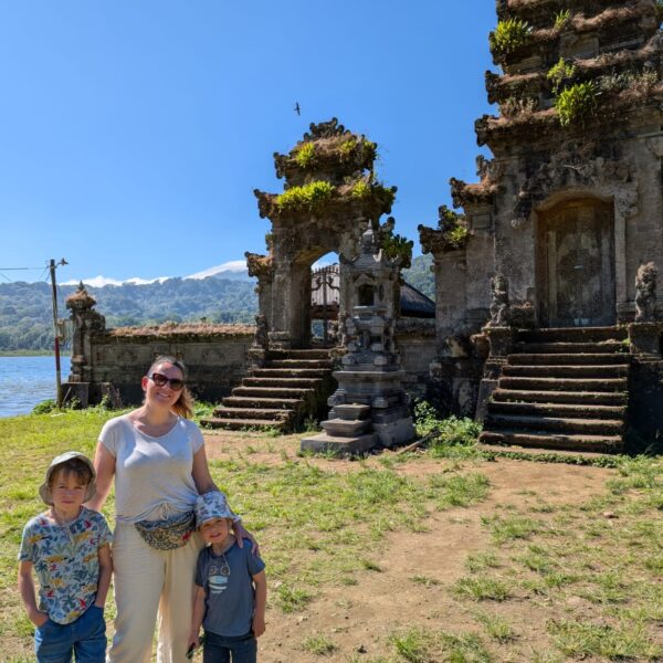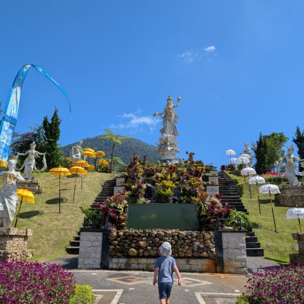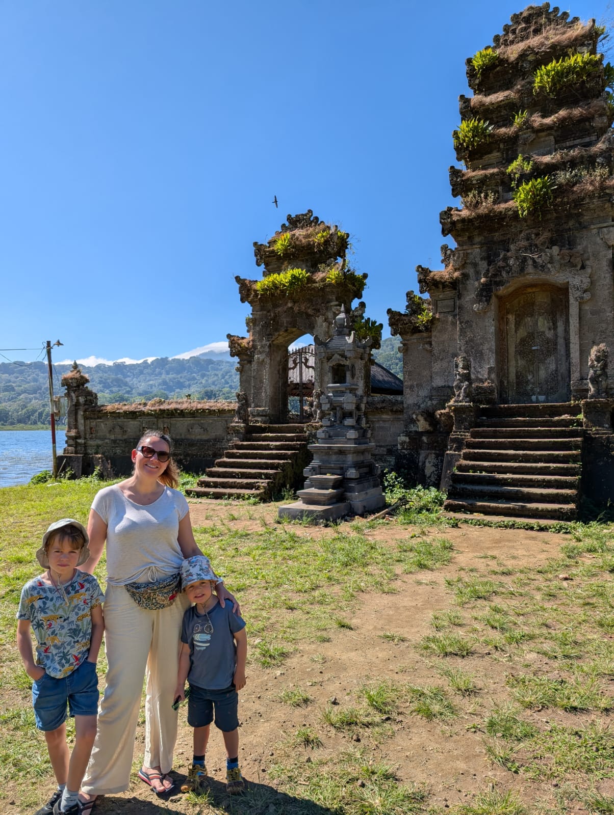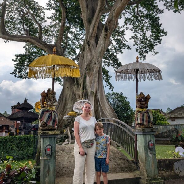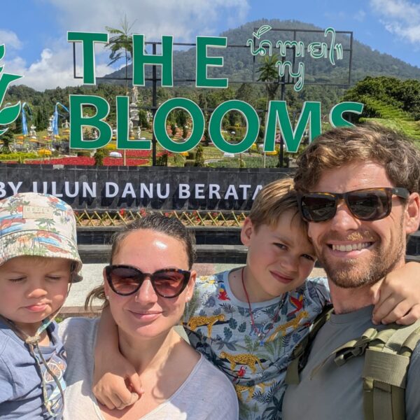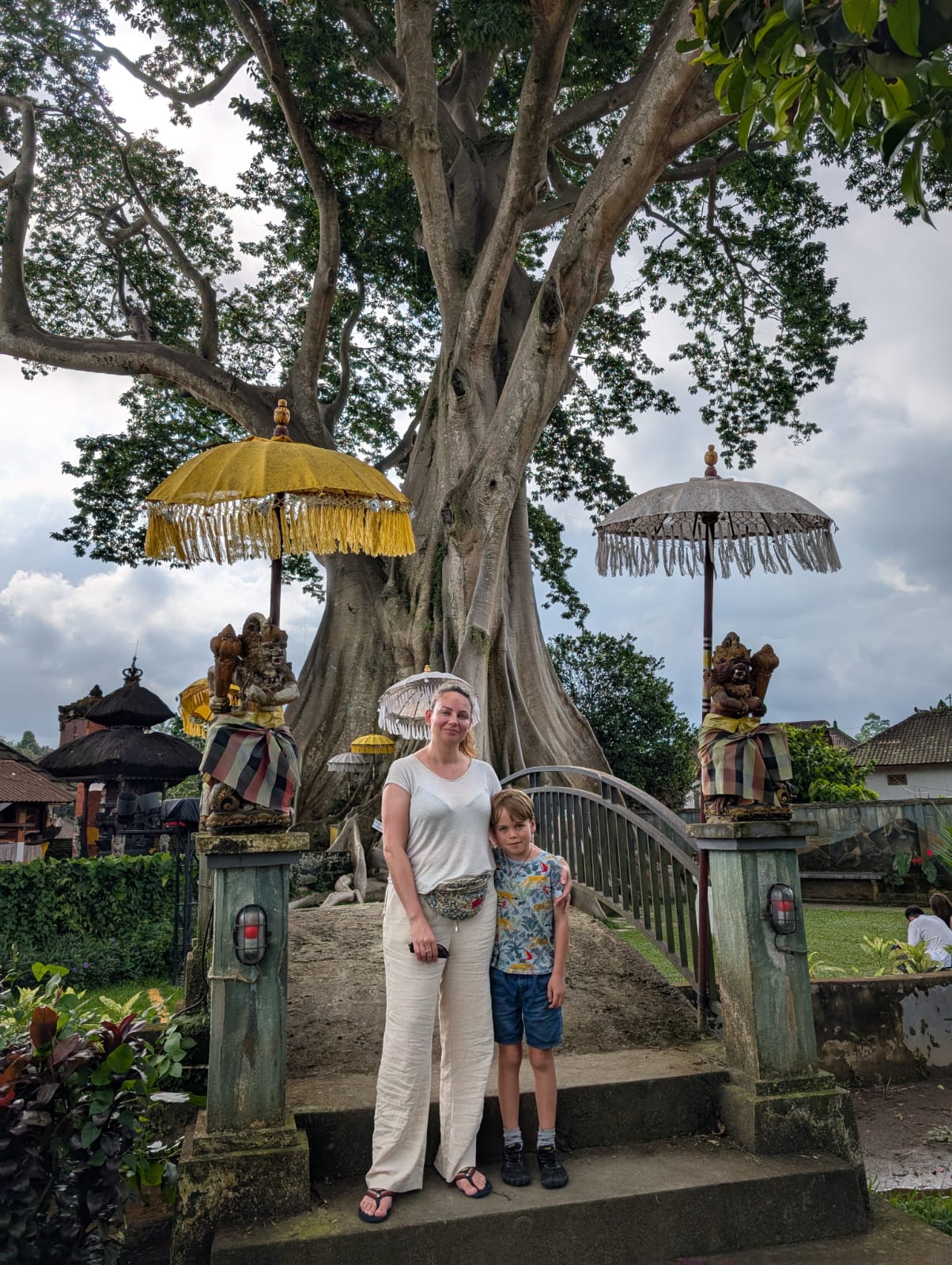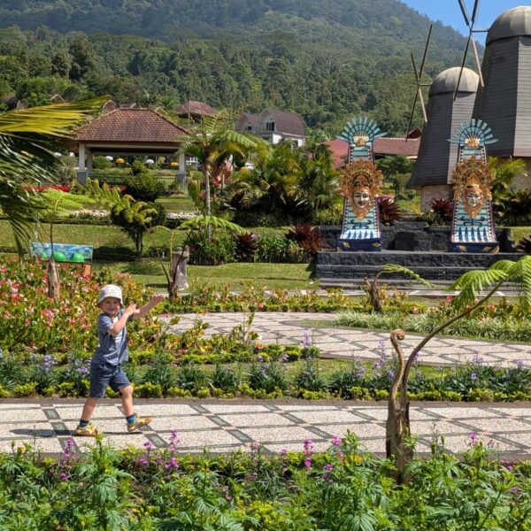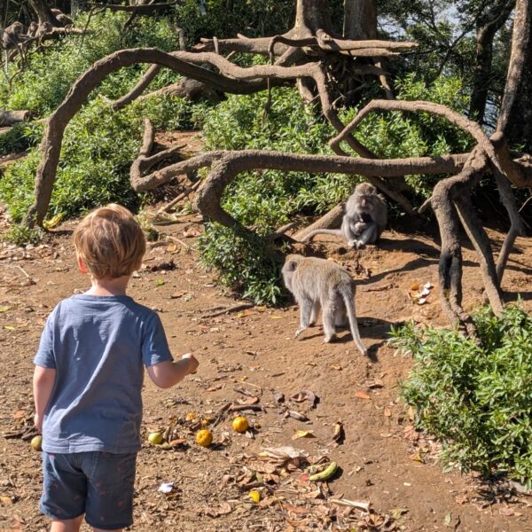 Pour cette premiĂšre journĂ©e d’excursions, nous avons dĂ©cidĂ© de visiter le Temple Tamblingan sur les conseils de notre chauffeur Budi. En chemin, nous avons vu des singes et Budi nous a proposĂ© de nous arrĂȘter pour les voir de plus prĂšs. Il a gentiment achetĂ© des cacahuĂštes sur le petit stand en face. Il y’avait beaucoup de bĂ©bĂ©s et les singes venaient Ă nous et prenaient dĂ©licatement (et rapidement) les cacahuĂštes de nos mains. Il y en a mĂȘme un qui a essayĂ© de me prendre le sac! Super moment pour les petits et les grands đ Nous sommes ensuite arrivĂ©s au Temple Tamblingan, au bord du lac. Nous Ă©tions seuls lĂ bas et c’Ă©tait trĂšs joli et serein. AprĂšs cela, nous sommes descendus plus au sud, visiter The Blooms Garden. LĂ encore, nous Ă©tions presque seuls et il faisait un temps idĂ©al. Le jardin Ă©tait magnifique (fleurs, sculptures, statues, poissons..) et nous avons passĂ© plusieurs heures Ă l’explorer. Nous avons mĂȘme Ă©tĂ© pris en photos par des touristes indonĂ©siens, probablement surpris de voir des petits blonds aux yeux bleus đ En route pour Ubud, nous nous sommes arrĂȘtĂ©s veoir the Bayan Ancient Tree, un arbre magnifique de 700 ans! Le soir nous avons dinĂ© Ă Ubud dans le meilleur restaurant vegan que nous avons jamais testĂ©. Tout Ă©tait exceptionnel: le cadre, les pizzas, burger, salade, filet de champignon grillĂ©, smoothies et les glaces (pistache Yummy!).Â