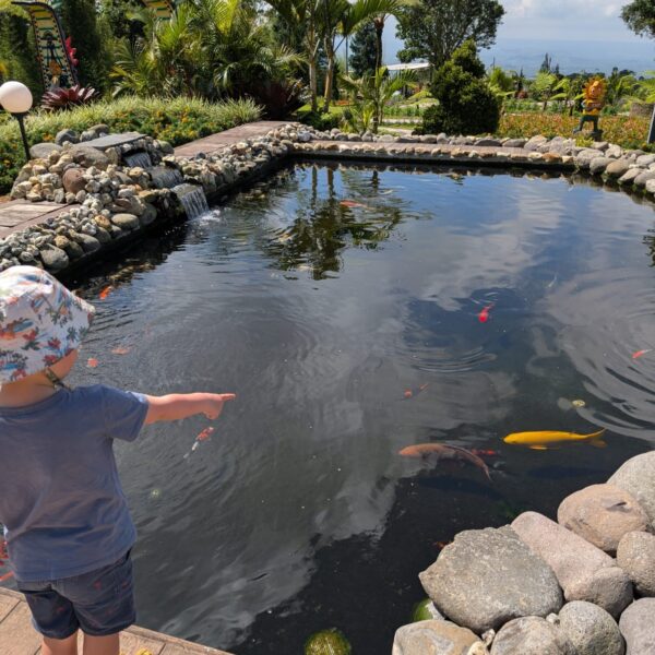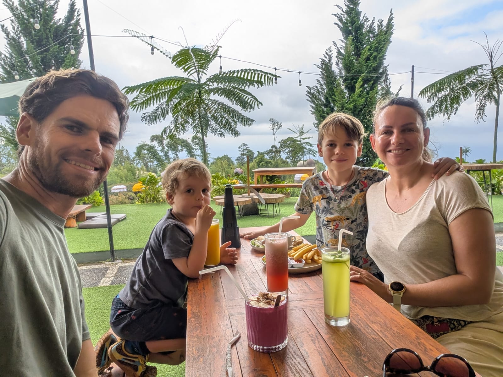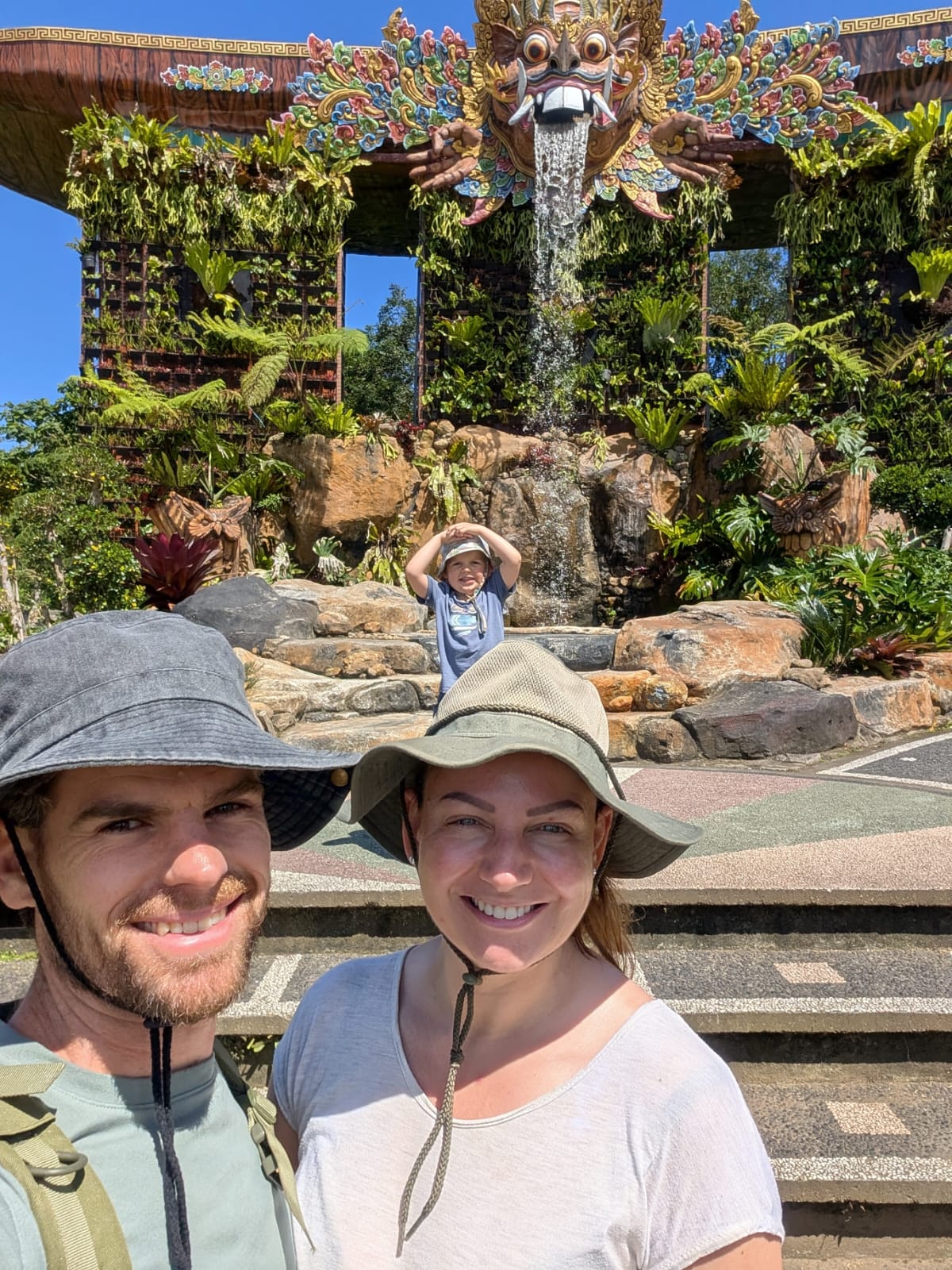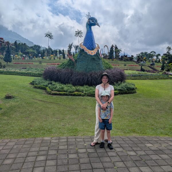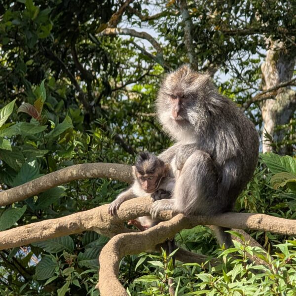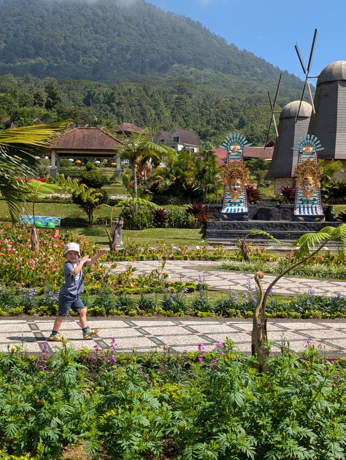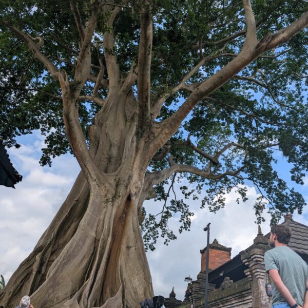 Pour cette premiĂšre journĂ©e d’excursions, nous avons dĂ©cidĂ© de visiter le Temple Tamblingan sur les conseils de notre chauffeur Budi. En chemin, nous avons vu des singes et Budi nous a proposĂ© de nous arrĂȘter pour les voir de plus prĂšs. Il a gentiment achetĂ© des cacahuĂštes sur le petit stand en face. Il y’avait beaucoup de bĂ©bĂ©s et les singes venaient Ă nous et prenaient dĂ©licatement (et rapidement) les cacahuĂštes de nos mains. Il y en a mĂȘme un qui a essayĂ© de me prendre le sac! Super moment pour les petits et les grands đ Nous sommes ensuite arrivĂ©s au Temple Tamblingan, au bord du lac. Nous Ă©tions seuls lĂ bas et c’Ă©tait trĂšs joli et serein. AprĂšs cela, nous sommes descendus plus au sud, visiter The Blooms Garden. LĂ encore, nous Ă©tions presque seuls et il faisait un temps idĂ©al. Le jardin Ă©tait magnifique (fleurs, sculptures, statues, poissons..) et nous avons passĂ© plusieurs heures Ă l’explorer. Nous avons mĂȘme Ă©tĂ© pris en photos par des touristes indonĂ©siens, probablement surpris de voir des petits blonds aux yeux bleus đ En route pour Ubud, nous nous sommes arrĂȘtĂ©s veoir the Bayan Ancient Tree, un arbre magnifique de 700 ans! Le soir nous avons dinĂ© Ă Ubud dans le meilleur restaurant vegan que nous avons jamais testĂ©. Tout Ă©tait exceptionnel: le cadre, les pizzas, burger, salade, filet de champignon grillĂ©, smoothies et les glaces (pistache Yummy!).Â