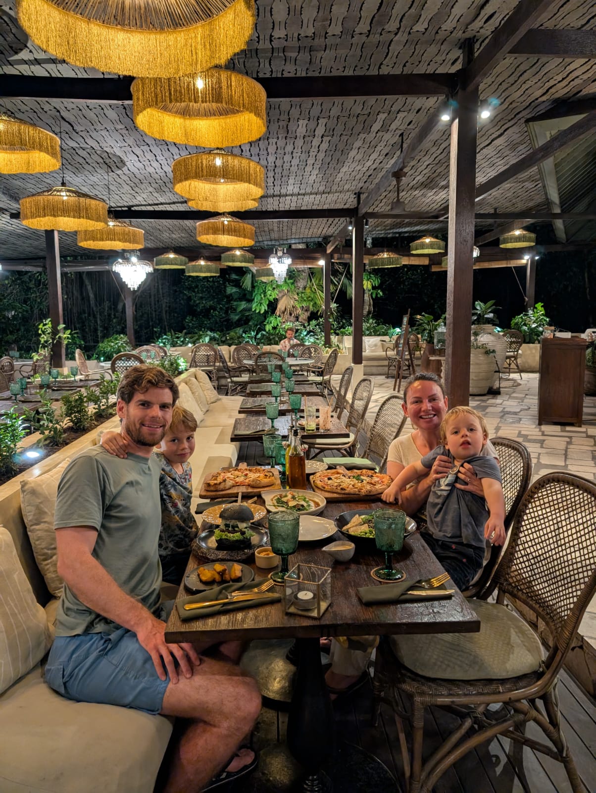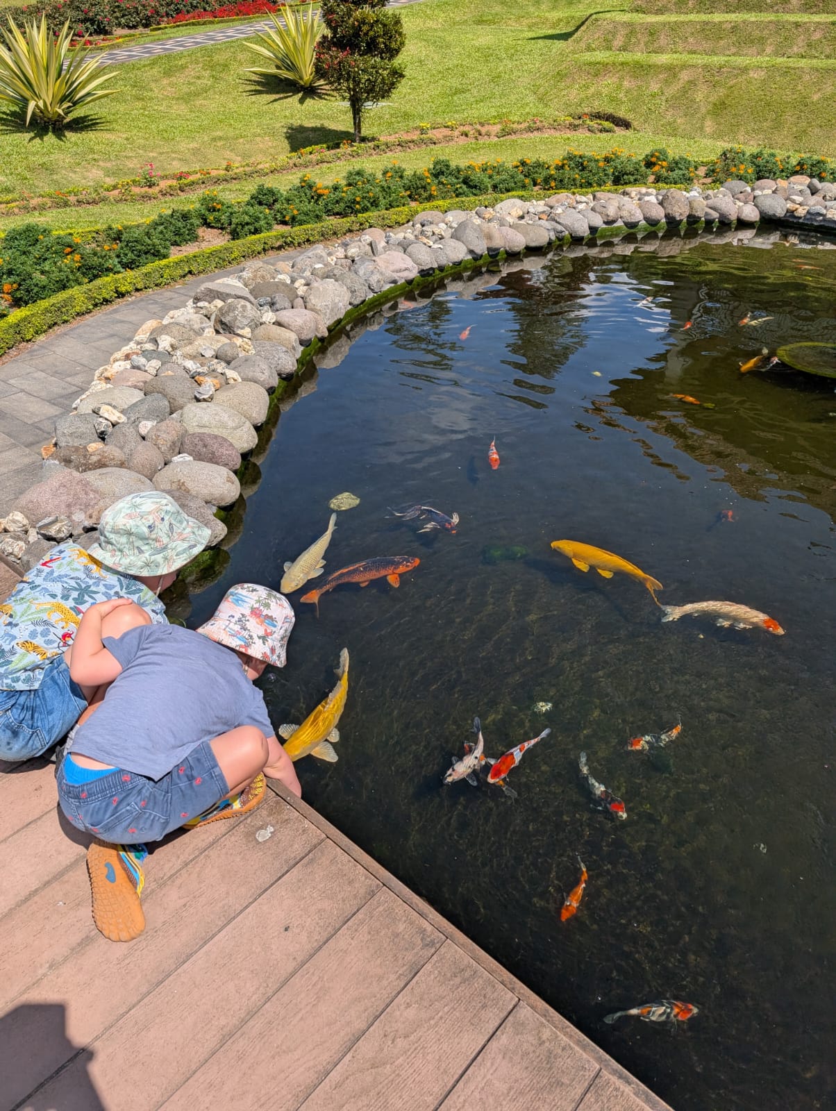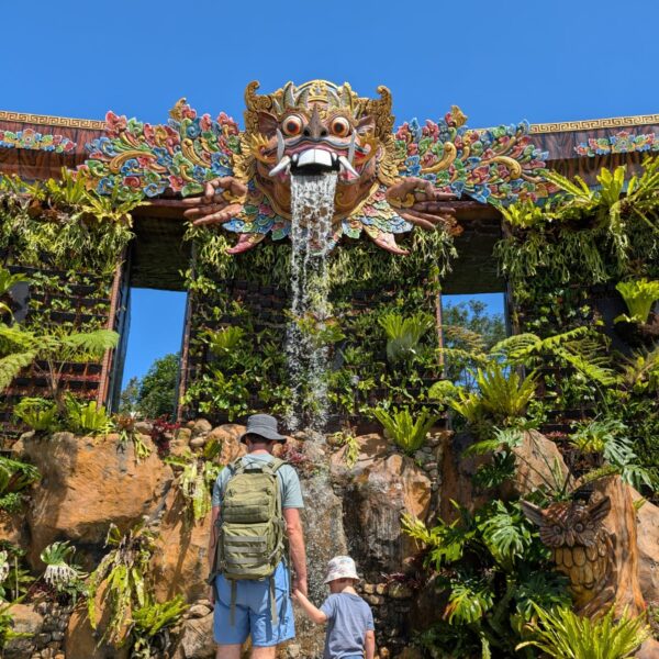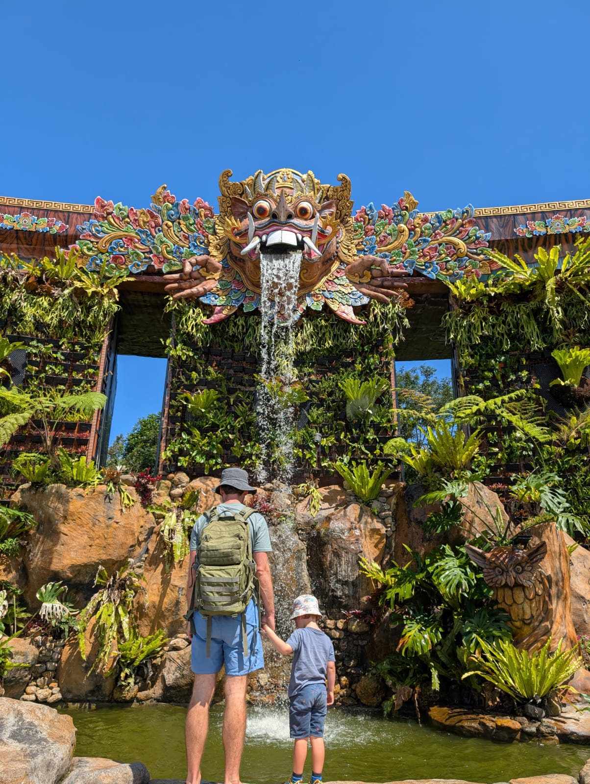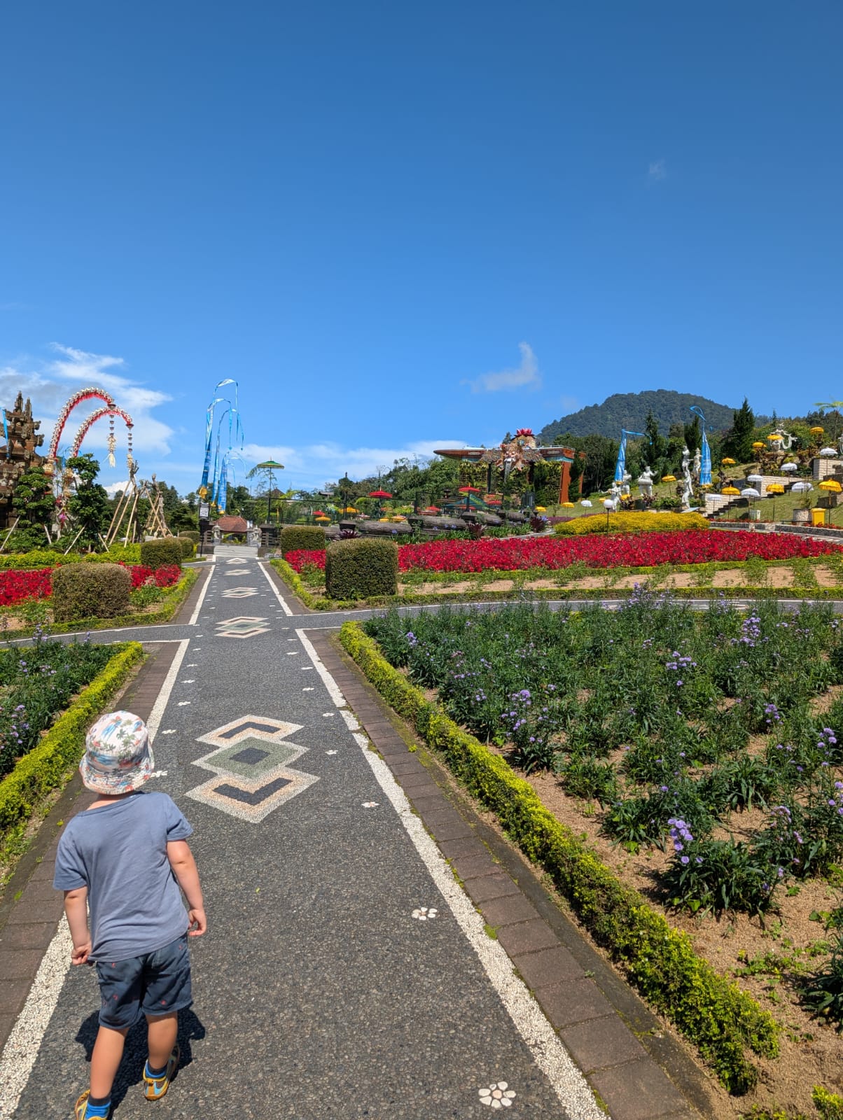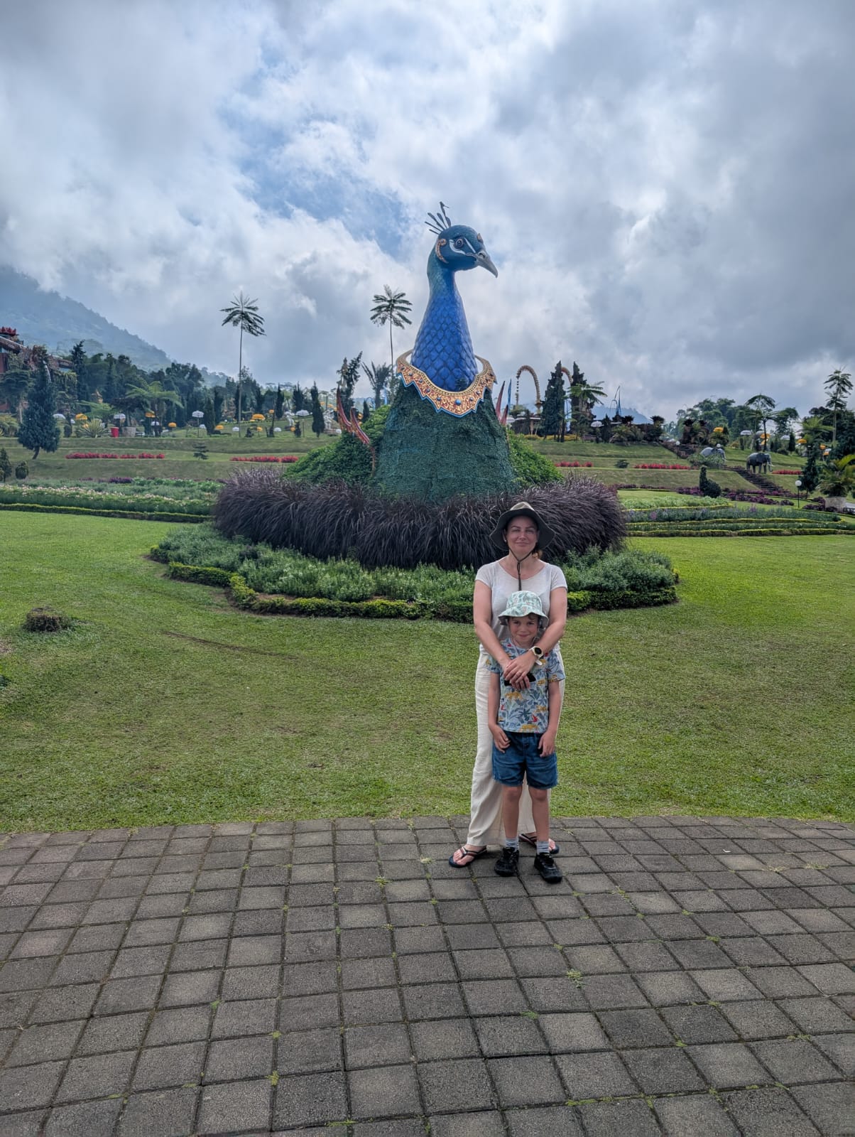 Pour cette premiĂšre journĂ©e d’excursions, nous avons dĂ©cidĂ© de visiter le Temple Tamblingan sur les conseils de notre chauffeur Budi. En chemin, nous avons vu des singes et Budi nous a proposĂ© de nous arrĂȘter pour les voir de plus prĂšs. Il a gentiment achetĂ© des cacahuĂštes sur le petit stand en face. Il y’avait beaucoup de bĂ©bĂ©s et les singes venaient Ă nous et prenaient dĂ©licatement (et rapidement) les cacahuĂštes de nos mains. Il y en a mĂȘme un qui a essayĂ© de me prendre le sac! Super moment pour les petits et les grands đ Nous sommes ensuite arrivĂ©s au Temple Tamblingan, au bord du lac. Nous Ă©tions seuls lĂ bas et c’Ă©tait trĂšs joli et serein. AprĂšs cela, nous sommes descendus plus au sud, visiter The Blooms Garden. LĂ encore, nous Ă©tions presque seuls et il faisait un temps idĂ©al. Le jardin Ă©tait magnifique (fleurs, sculptures, statues, poissons..) et nous avons passĂ© plusieurs heures Ă l’explorer. Nous avons mĂȘme Ă©tĂ© pris en photos par des touristes indonĂ©siens, probablement surpris de voir des petits blonds aux yeux bleus đ En route pour Ubud, nous nous sommes arrĂȘtĂ©s veoir the Bayan Ancient Tree, un arbre magnifique de 700 ans! Le soir nous avons dinĂ© Ă Ubud dans le meilleur restaurant vegan que nous avons jamais testĂ©. Tout Ă©tait exceptionnel: le cadre, les pizzas, burger, salade, filet de champignon grillĂ©, smoothies et les glaces (pistache Yummy!).Â