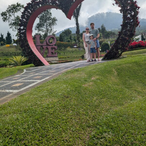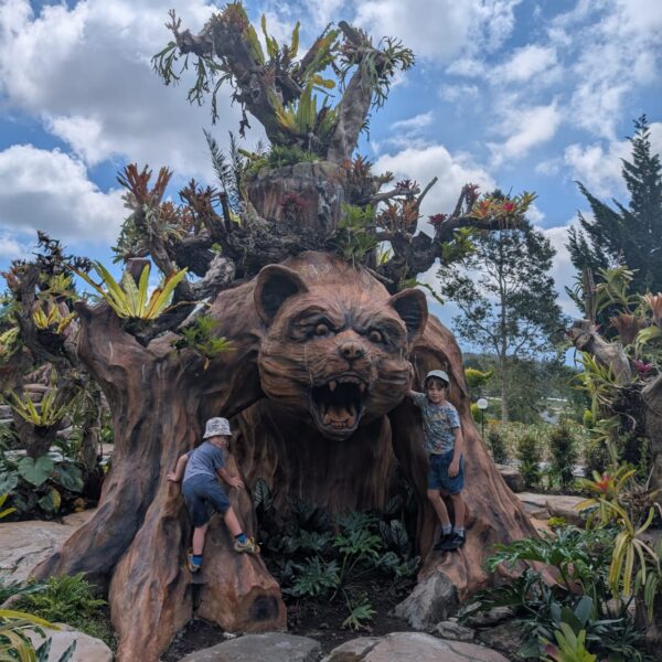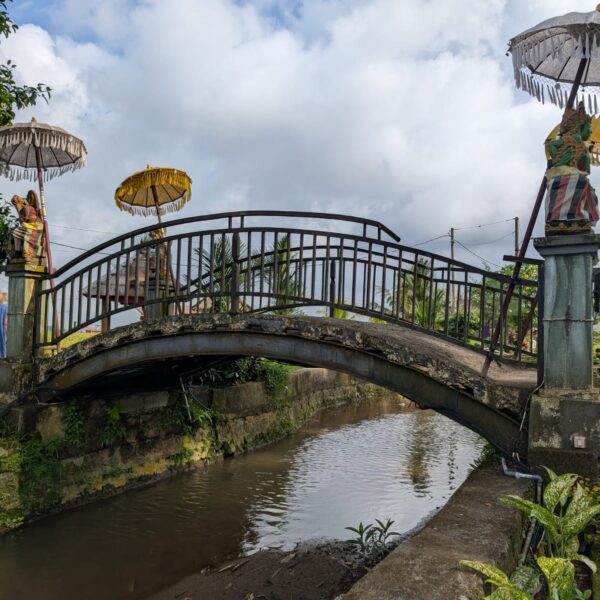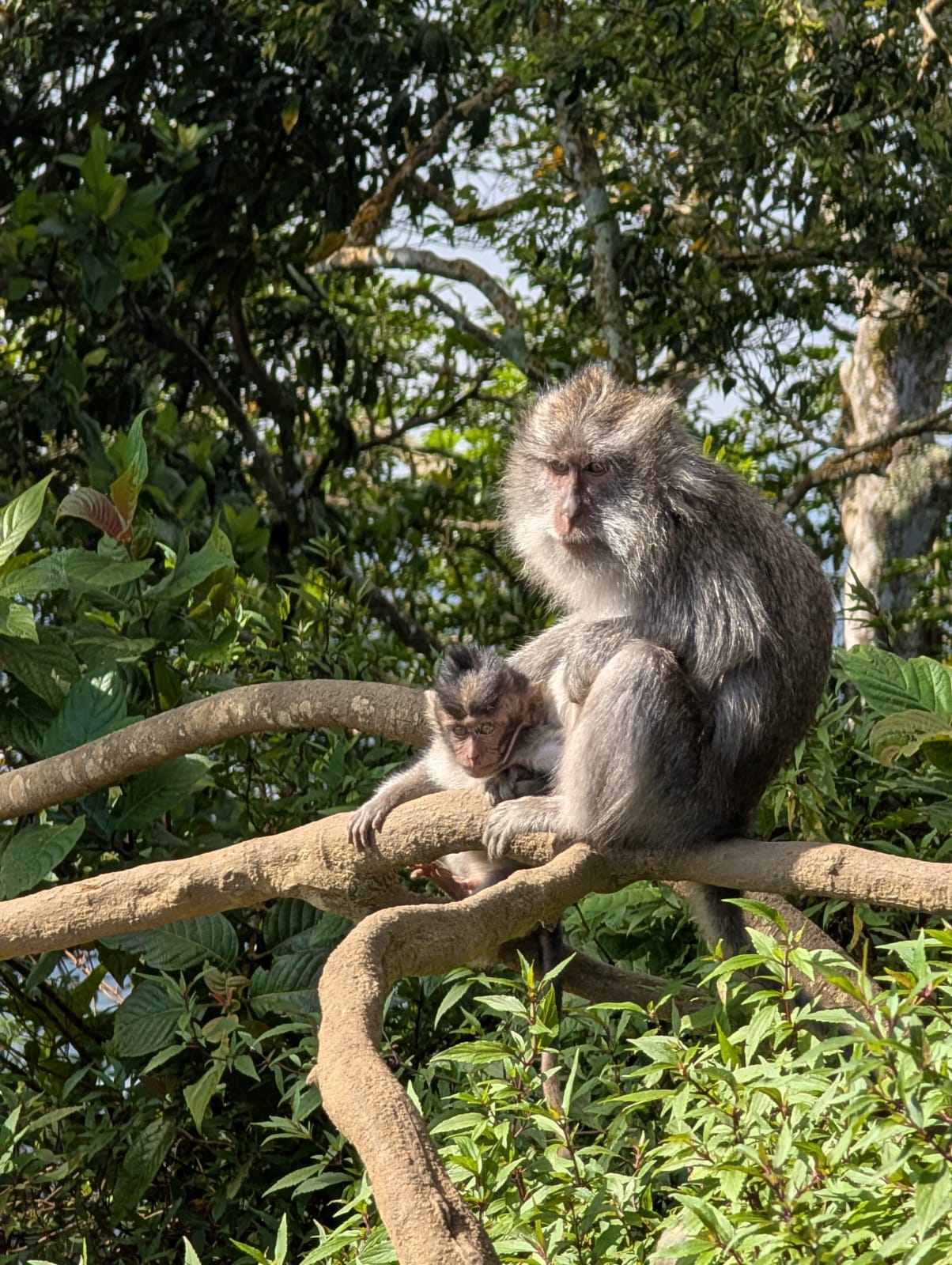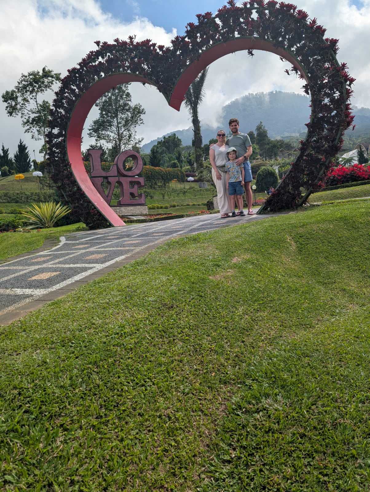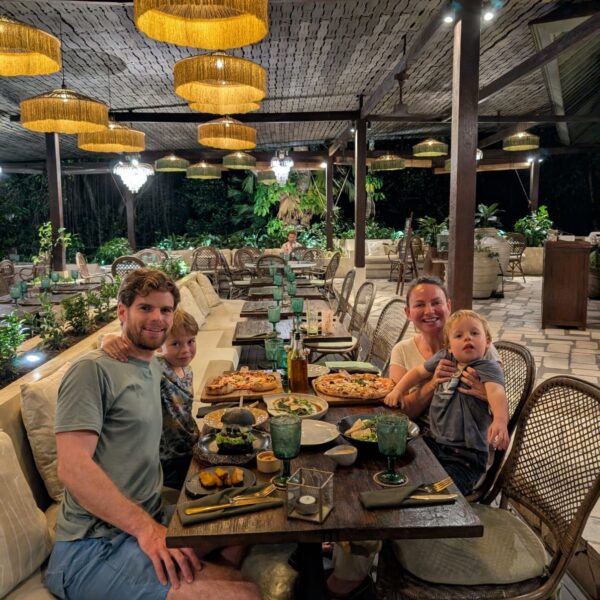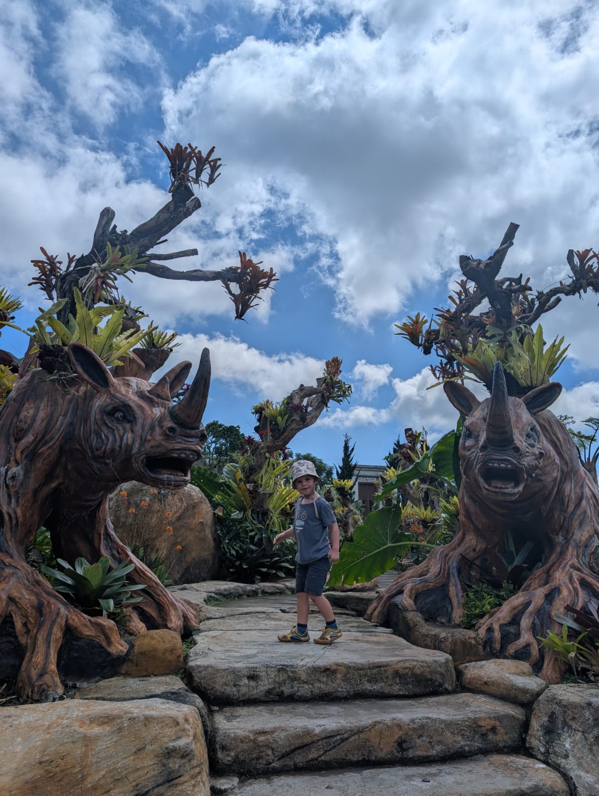 Pour cette premiĂšre journĂ©e d’excursions, nous avons dĂ©cidĂ© de visiter le Temple Tamblingan sur les conseils de notre chauffeur Budi. En chemin, nous avons vu des singes et Budi nous a proposĂ© de nous arrĂȘter pour les voir de plus prĂšs. Il a gentiment achetĂ© des cacahuĂštes sur le petit stand en face. Il y’avait beaucoup de bĂ©bĂ©s et les singes venaient Ă nous et prenaient dĂ©licatement (et rapidement) les cacahuĂštes de nos mains. Il y en a mĂȘme un qui a essayĂ© de me prendre le sac! Super moment pour les petits et les grands đ Nous sommes ensuite arrivĂ©s au Temple Tamblingan, au bord du lac. Nous Ă©tions seuls lĂ bas et c’Ă©tait trĂšs joli et serein. AprĂšs cela, nous sommes descendus plus au sud, visiter The Blooms Garden. LĂ encore, nous Ă©tions presque seuls et il faisait un temps idĂ©al. Le jardin Ă©tait magnifique (fleurs, sculptures, statues, poissons..) et nous avons passĂ© plusieurs heures Ă l’explorer. Nous avons mĂȘme Ă©tĂ© pris en photos par des touristes indonĂ©siens, probablement surpris de voir des petits blonds aux yeux bleus đ En route pour Ubud, nous nous sommes arrĂȘtĂ©s veoir the Bayan Ancient Tree, un arbre magnifique de 700 ans! Le soir nous avons dinĂ© Ă Ubud dans le meilleur restaurant vegan que nous avons jamais testĂ©. Tout Ă©tait exceptionnel: le cadre, les pizzas, burger, salade, filet de champignon grillĂ©, smoothies et les glaces (pistache Yummy!).Â