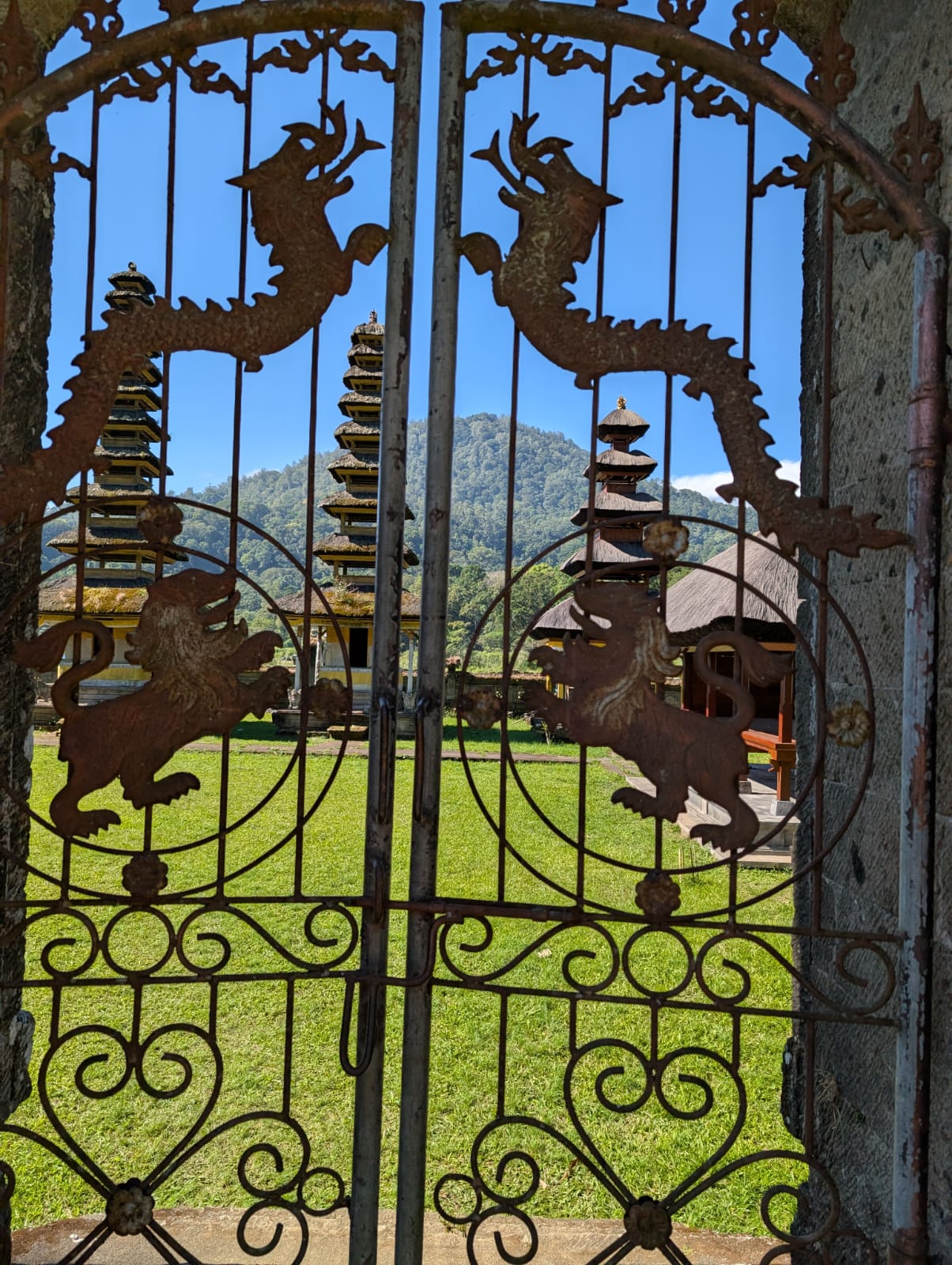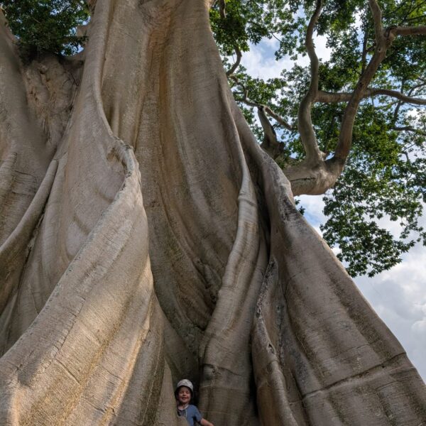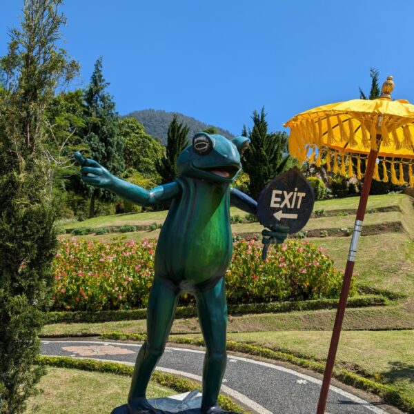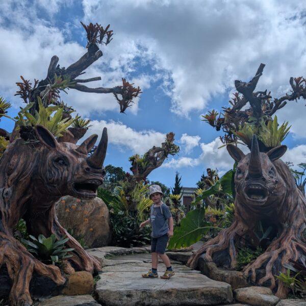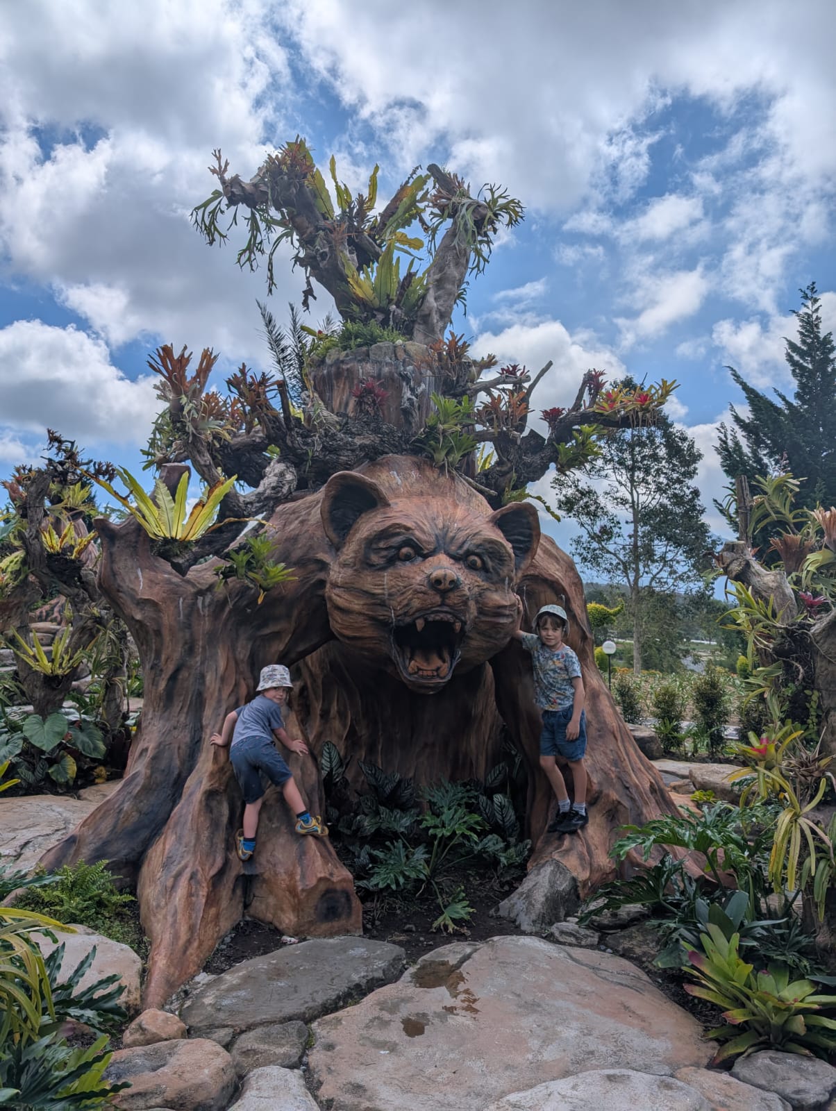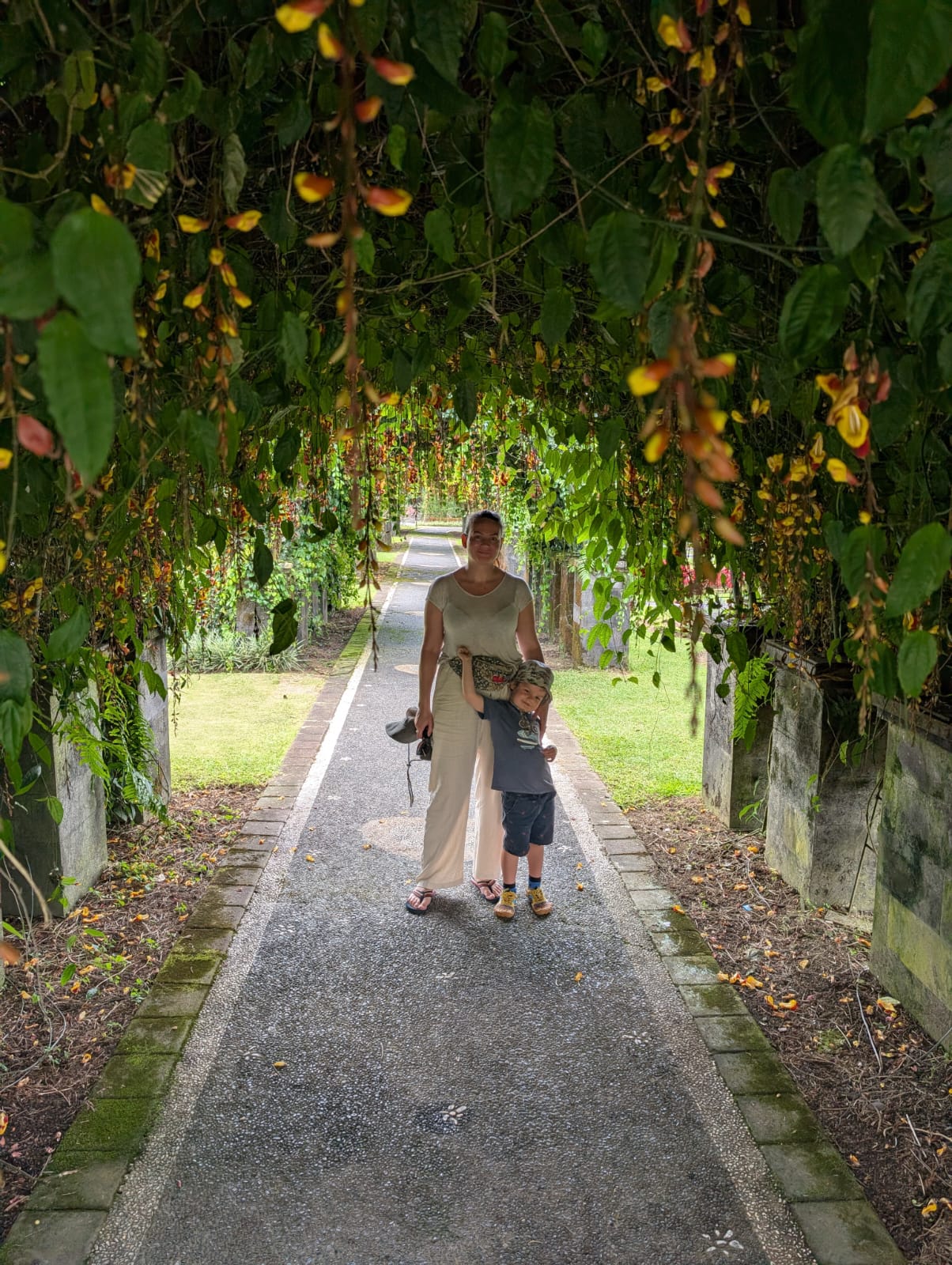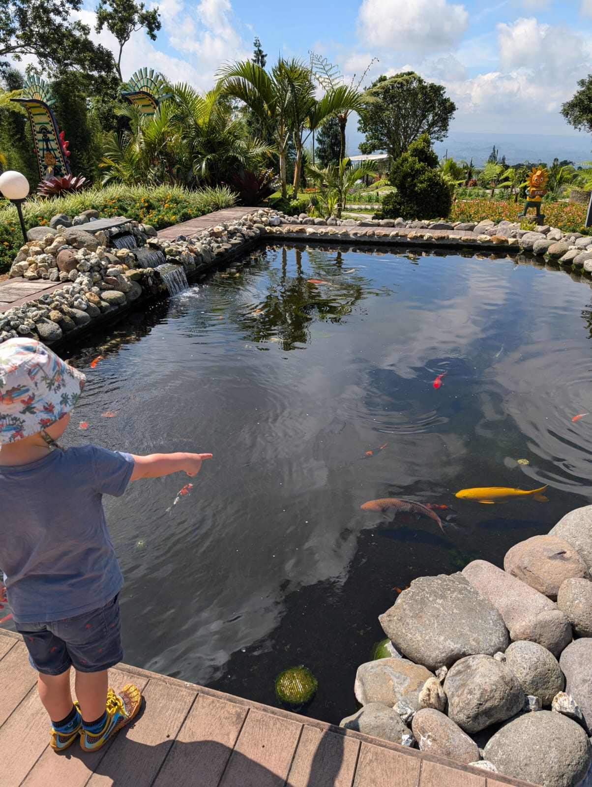 Pour cette premiĂšre journĂ©e d’excursions, nous avons dĂ©cidĂ© de visiter le Temple Tamblingan sur les conseils de notre chauffeur Budi. En chemin, nous avons vu des singes et Budi nous a proposĂ© de nous arrĂȘter pour les voir de plus prĂšs. Il a gentiment achetĂ© des cacahuĂštes sur le petit stand en face. Il y’avait beaucoup de bĂ©bĂ©s et les singes venaient Ă nous et prenaient dĂ©licatement (et rapidement) les cacahuĂštes de nos mains. Il y en a mĂȘme un qui a essayĂ© de me prendre le sac! Super moment pour les petits et les grands đ Nous sommes ensuite arrivĂ©s au Temple Tamblingan, au bord du lac. Nous Ă©tions seuls lĂ bas et c’Ă©tait trĂšs joli et serein. AprĂšs cela, nous sommes descendus plus au sud, visiter The Blooms Garden. LĂ encore, nous Ă©tions presque seuls et il faisait un temps idĂ©al. Le jardin Ă©tait magnifique (fleurs, sculptures, statues, poissons..) et nous avons passĂ© plusieurs heures Ă l’explorer. Nous avons mĂȘme Ă©tĂ© pris en photos par des touristes indonĂ©siens, probablement surpris de voir des petits blonds aux yeux bleus đ En route pour Ubud, nous nous sommes arrĂȘtĂ©s veoir the Bayan Ancient Tree, un arbre magnifique de 700 ans! Le soir nous avons dinĂ© Ă Ubud dans le meilleur restaurant vegan que nous avons jamais testĂ©. Tout Ă©tait exceptionnel: le cadre, les pizzas, burger, salade, filet de champignon grillĂ©, smoothies et les glaces (pistache Yummy!).Â