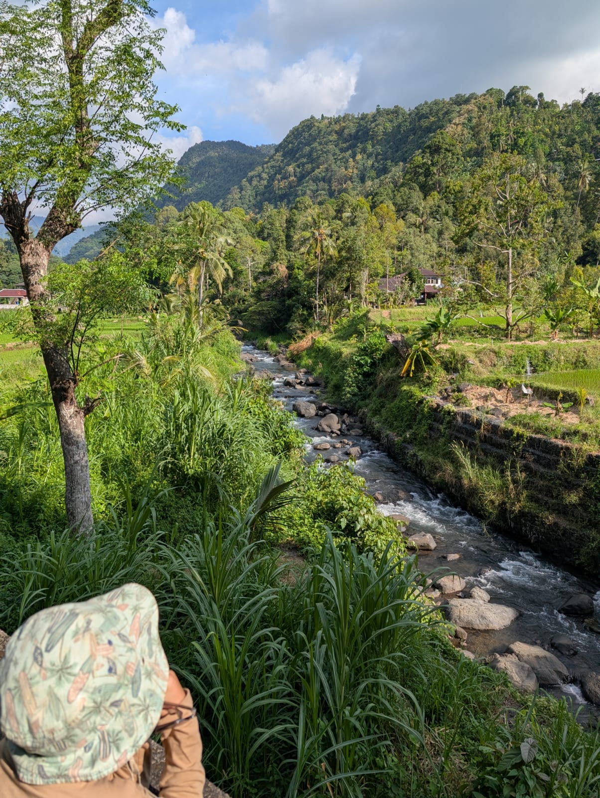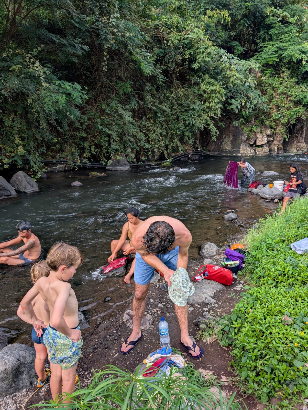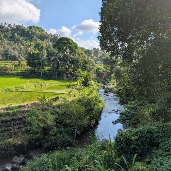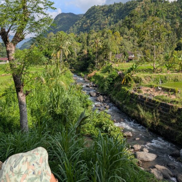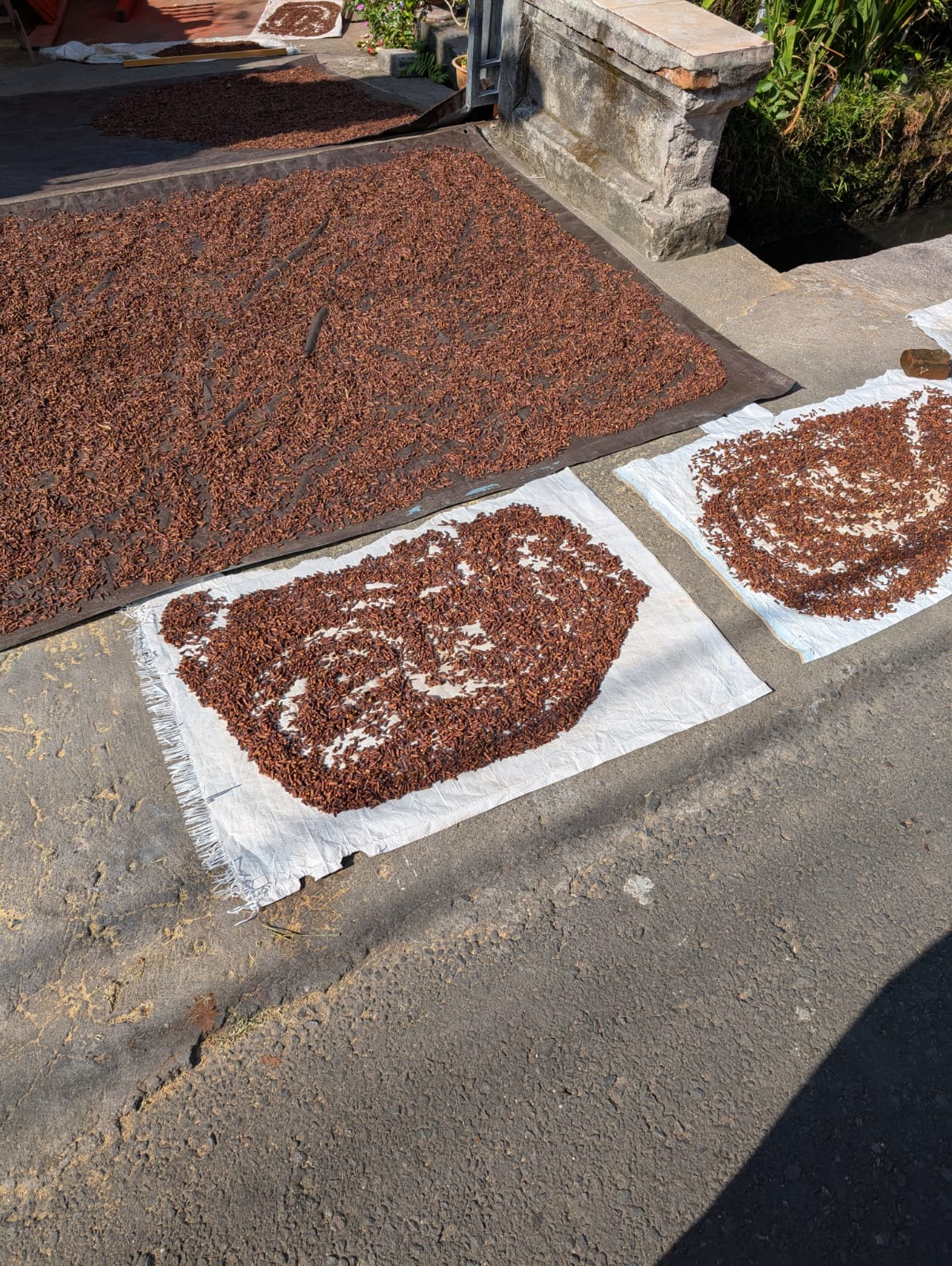 Alistair court tous les jours entre 6 et 15kms et a découvert de jolis coins autour de la maison. Mercredi nous avons fait une jolie balade jusqu’à la rivière. En chemin, nous avons vu beaucoup de clous de girofle qui séchaient au soleil. Les paysages du nord de Bali sont magnifiques et les gens sont très gentils. Un petit garçon nous a montré où nous baigner et peu de temps après, nous avons été rejoint par plusieurs familles qui venaient se laver ou faire leurs lessives.
