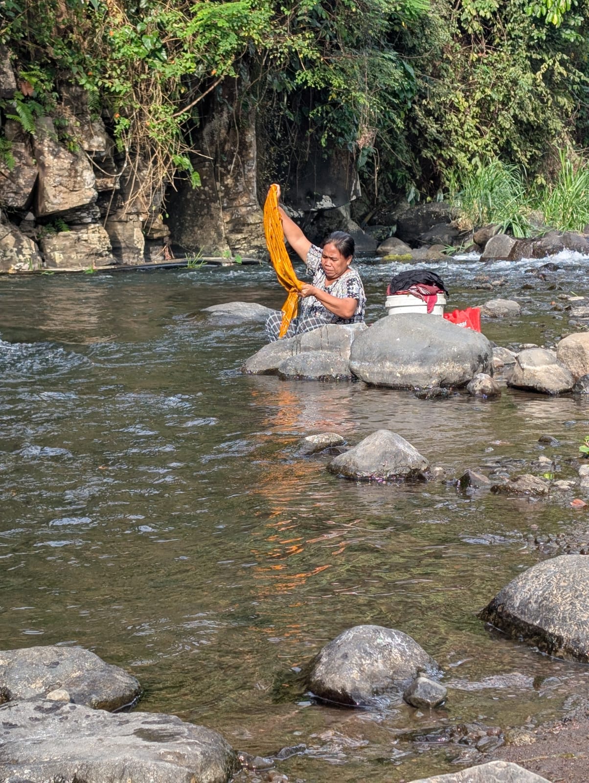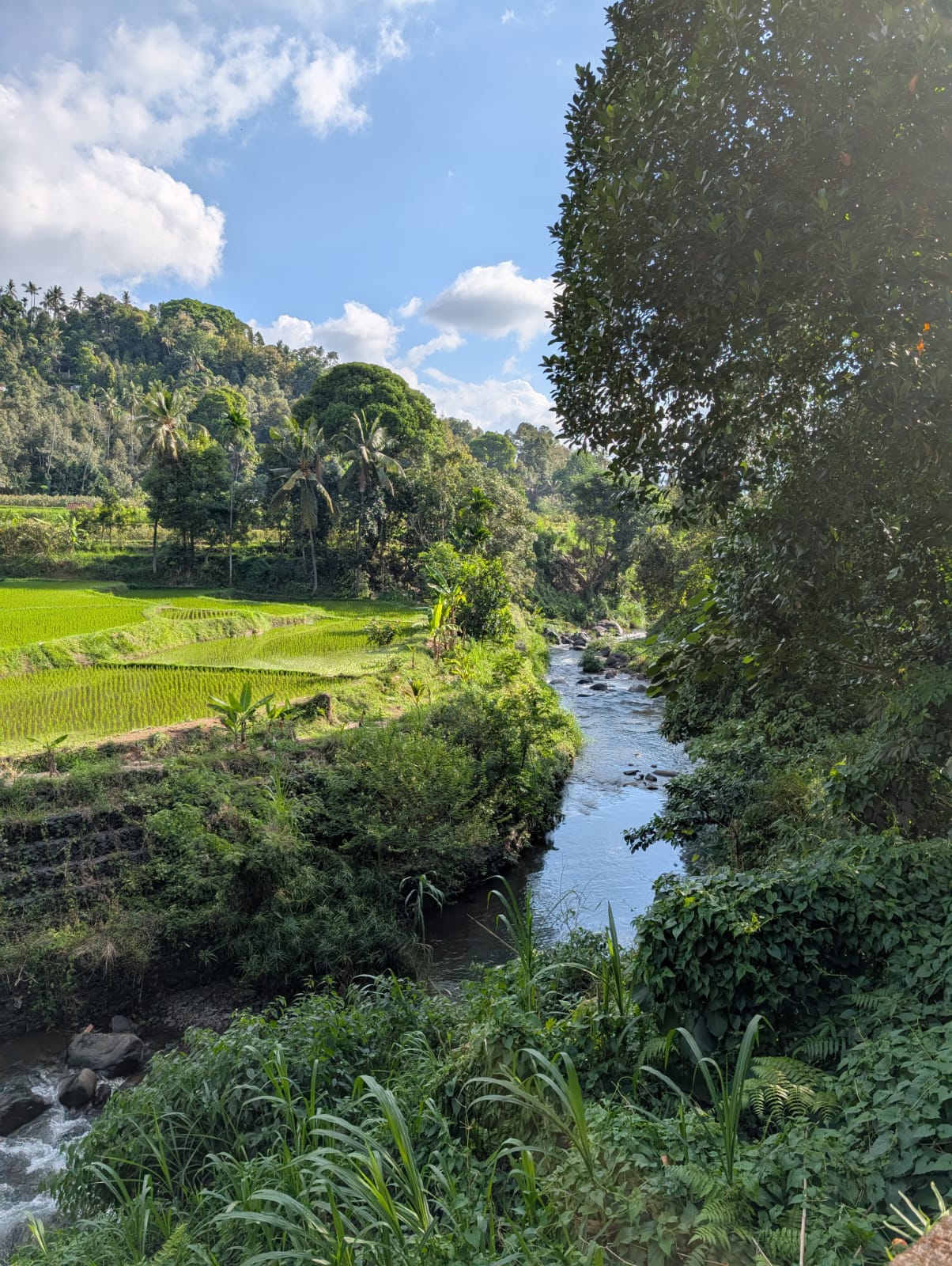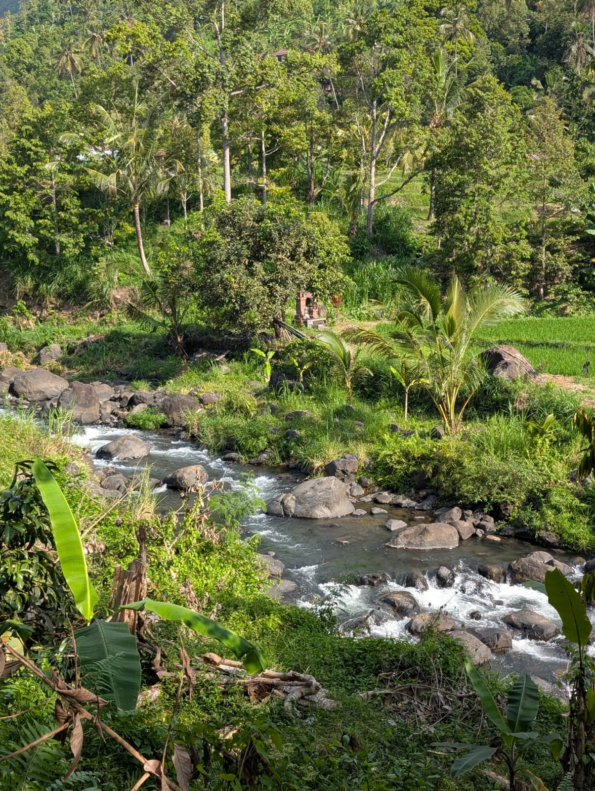 Alistair court tous les jours entre 6 et 15kms et a découvert de jolis coins autour de la maison. Mercredi nous avons fait une jolie balade jusqu’à la rivière. En chemin, nous avons vu beaucoup de clous de girofle qui séchaient au soleil. Les paysages du nord de Bali sont magnifiques et les gens sont très gentils. Un petit garçon nous a montré où nous baigner et peu de temps après, nous avons été rejoint par plusieurs familles qui venaient se laver ou faire leurs lessives.
