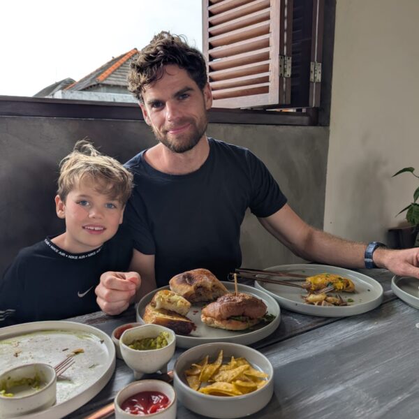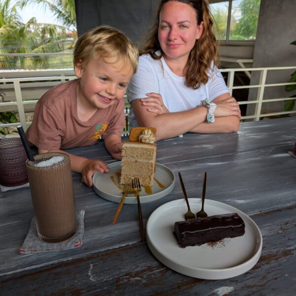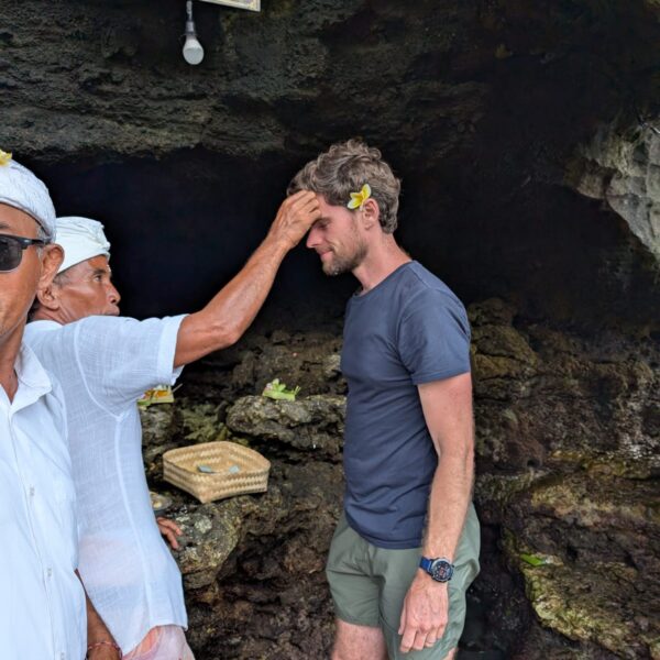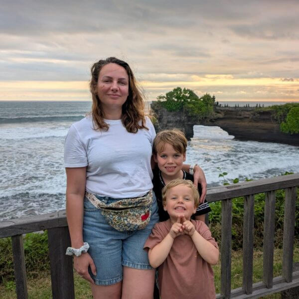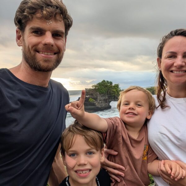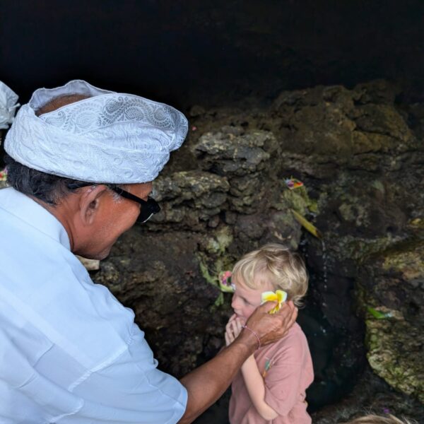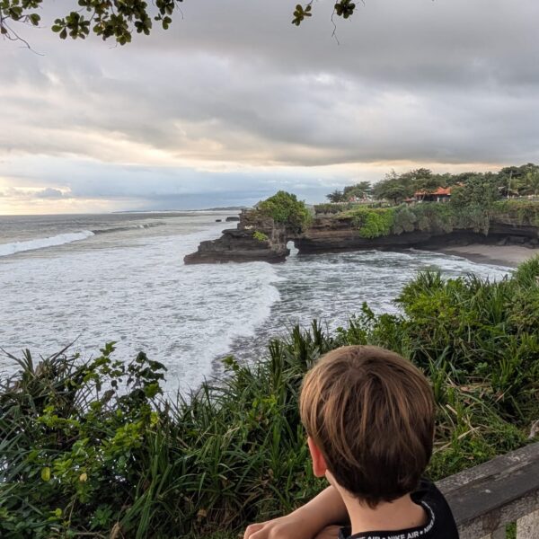 Pour cette troisiĂšme journĂ©e d’excursions, nous avons dĂ©cidĂ© d’aller voir la cascade Bengbengan. Google Map indiquait 35 minutes depuis la guesthouse mais en temps balinais, il faut doubler et ajouter encore un petit quelque chose. Donc 1h15 aprĂšs ĂȘtre partis, quelques demi-tours et des explications parfois contradictoires des habitants du village, nous avons trouvĂ© un chemin escarpĂ©, glissant, au milieu de nulle part avec un petit panneau indiquant “Bengbengan Waterfall”. Les enfants se sont super bien dĂ©brouillĂ©s et aprĂšs 20 minutes de descente, nous sommes arrivĂ©s Ă une cascade magnifique, avec juste nous, la jungle et le bruit de l’eau (pour info, la cascade fait un bruit d’ helicoptĂšre et produit Ă©normĂ©ment de vent). Alistair m’a trainĂ©e dessous mais la puissance de la cascade fait un peu mal. La remontĂ©e Ă©tait un peu plus difficile et dans les bras d’Alistair pour Lilio. AprĂšs la cascade, direction le Temple Taman Ayun. LĂ encore, petites dĂ©convenues sur le temps de trajet avec 3 rues bloquĂ©es. Mais c’Ă©tait trĂšs joli, LĂ©onard a vu un Ă©cureuil et une gross araignĂ©e. On a fait une belle promenade dans le temple et la forĂȘt. Ensuite stop dĂ©jeuner dans un restaurant vegan “I am Vegan Babe”. Super bon (mais pas aussi bon que le resto d’Ubud). Pour terminer la journĂ©e, Temple sur l’ocĂ©an, Tanah Lot. Beaucoup beaucoup de touristes, beaucoup de petites boutiques oĂč tout le monde vient te parler pour te vendre quelque chose et franchement c’Ă©tait pas mal mais pas incontournable. Les enfants ont quand mĂȘme aimĂ© mettre les pieds dans l’eau et on a fait de jolies photos de famille đ
