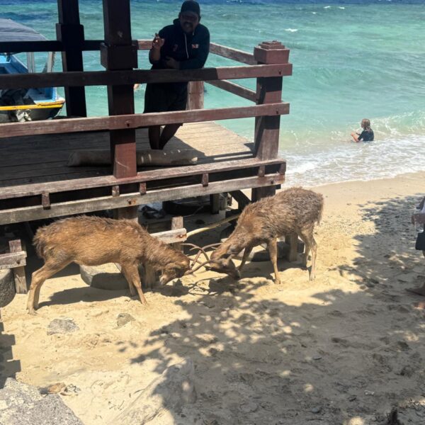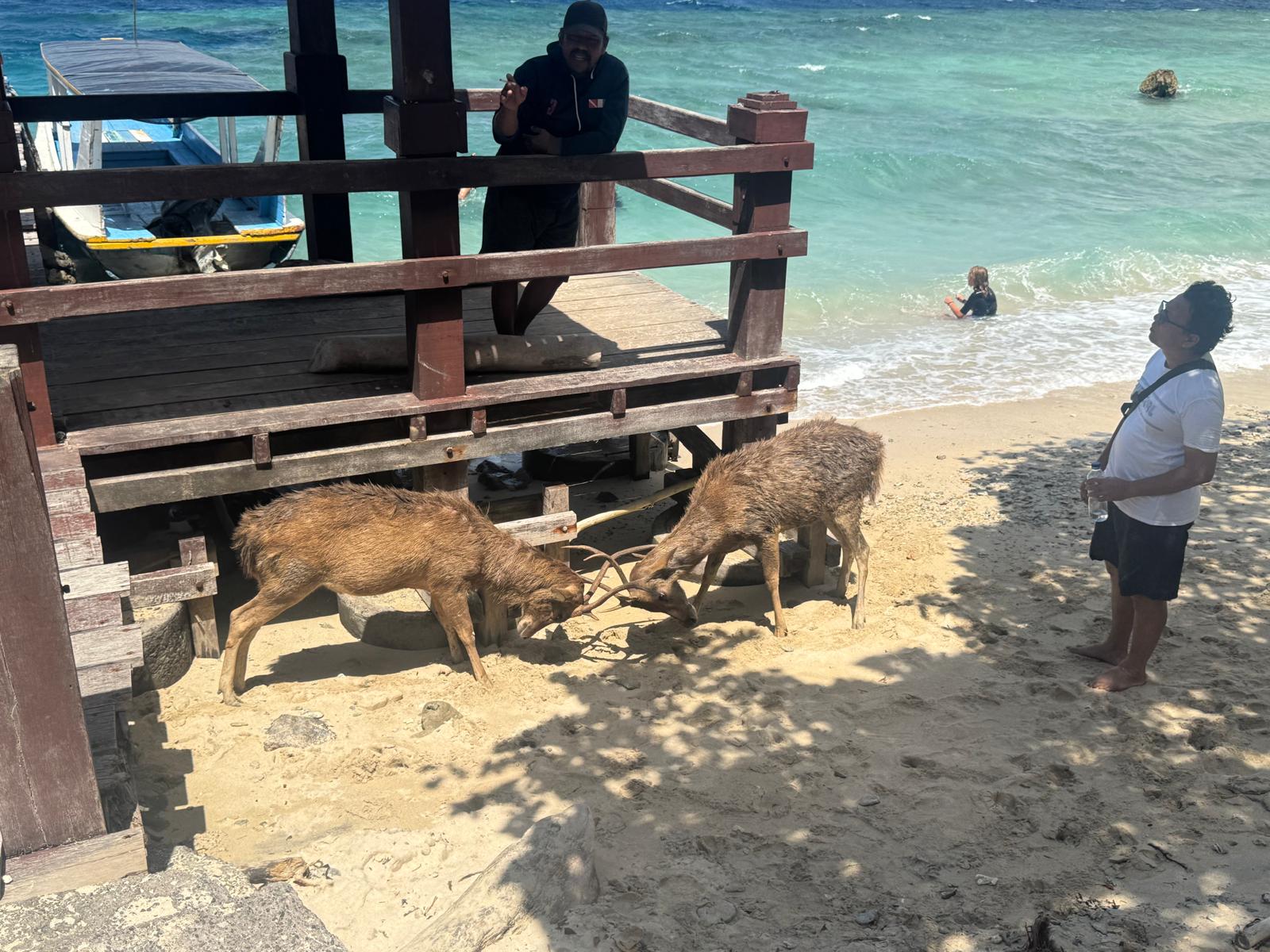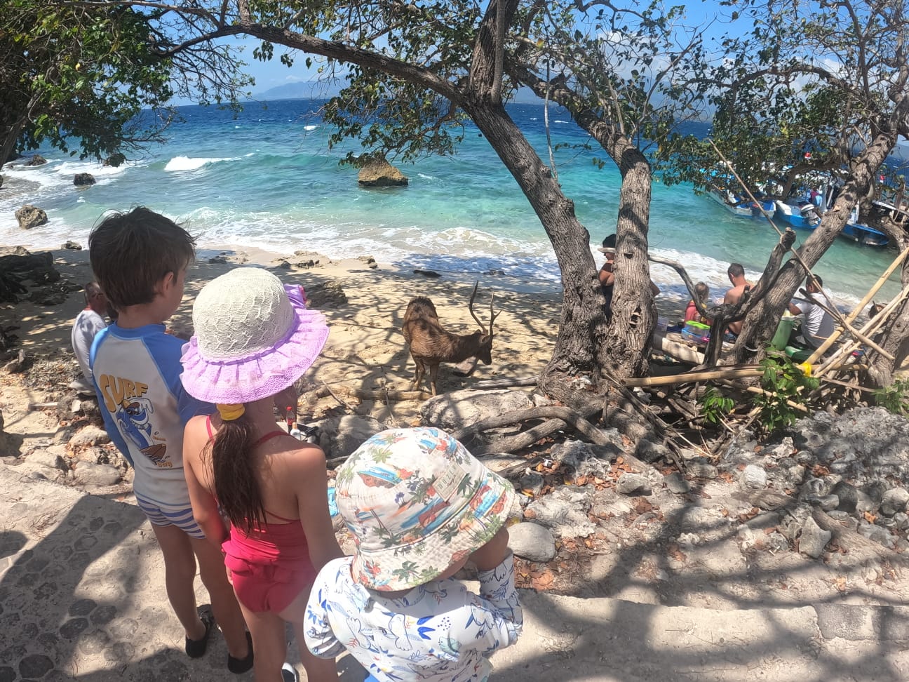 Après le snorkelling, déjeuner sur une plage de sable blanc avec pour compagnie des cerfs gourmands. Les cerfs sont habitués aux touristes et n’hésitent pas à se rapprocher pour voler la nourriture. Pauvre petite Jade est même tombée et un cerf lui a marché dessus pour attraper son sandwich! Plus de peur que de mal heureusement!