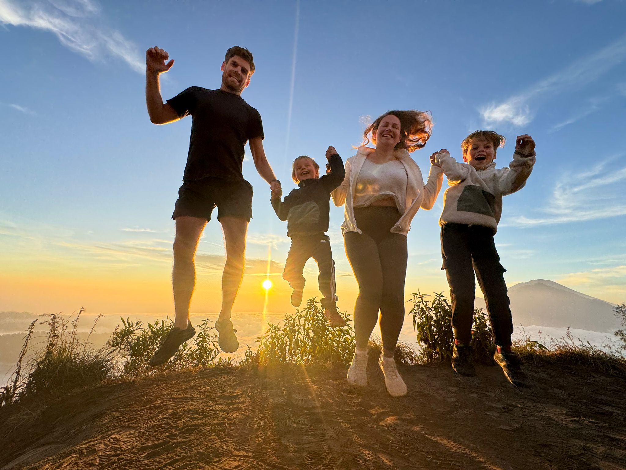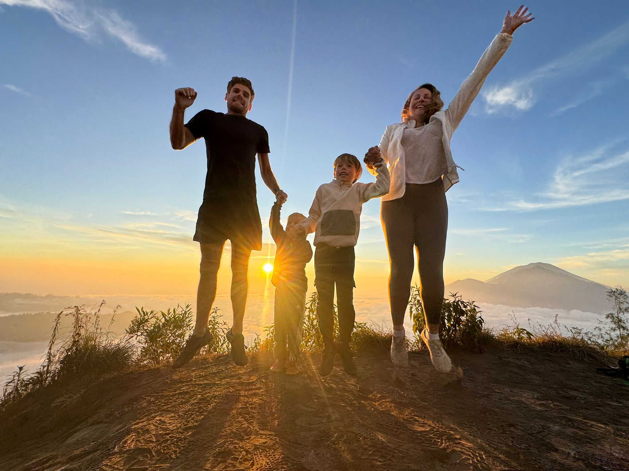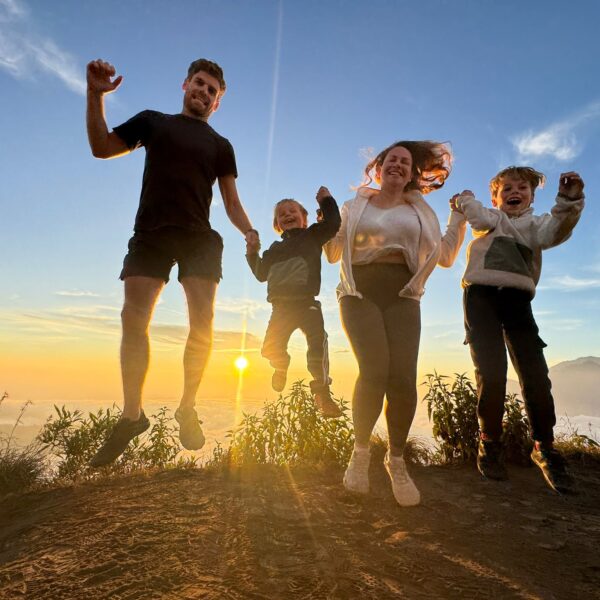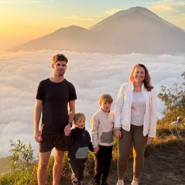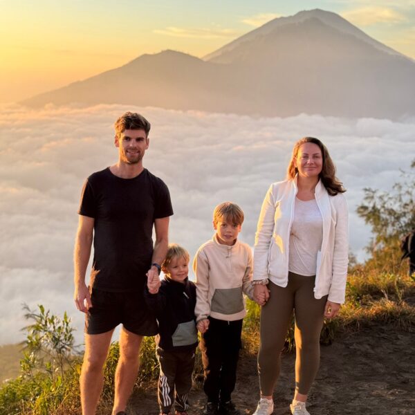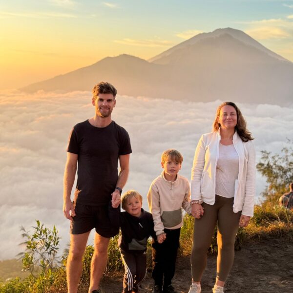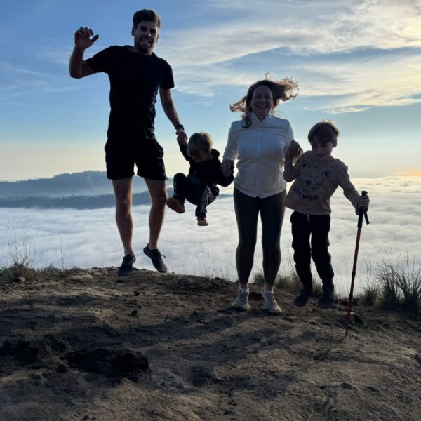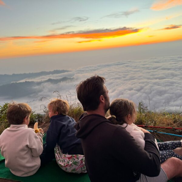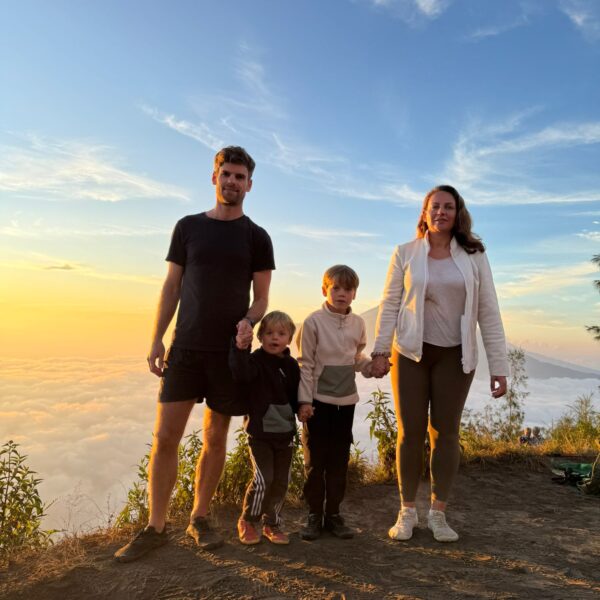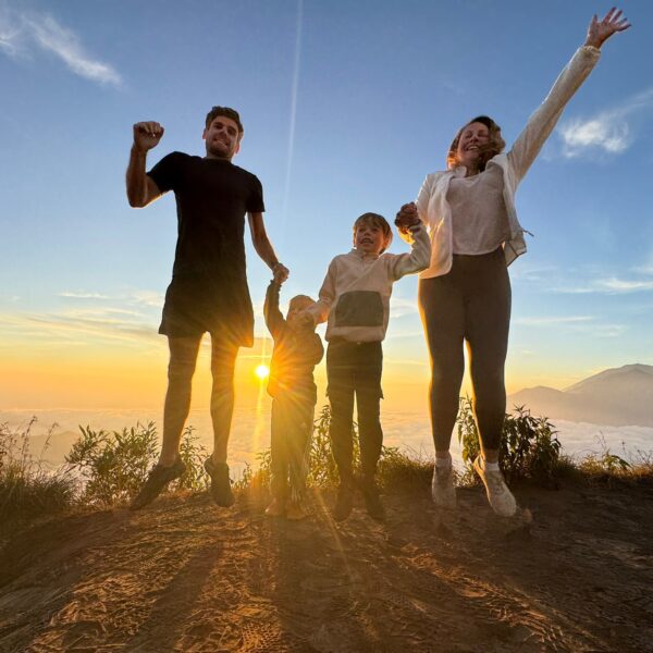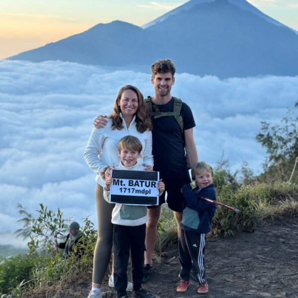 Lundi 25 Août, randonnée sur le Volcan Mount Batur tous ensemble. Départ de la maison, minuit et demi pour Marie, Mika et Jade, 1h30 pour nous. 2h de trajet, arrivée au pied du volcan à 3h30 du matin et il faisait froid (beaucoup beaucoup plus froid que dans le nord de Bali). 20 minutes de Jeep suivies d’1h30 d’ascension. J’avais convaincu Alistair que non, les tongs pour monter le volcan ce n’était pas le meilleur choix, et heureusement! Les enfants ont été super. On montait avec les lampes torches et on ne voyait presque rien. Arrivés au sommet, vue imprenable, lever du soleil magnifique, photoshoot avec le guide. Un de nos meilleurs moments à Bali. Avant de rentrer, nous nous sommes arrêtés aux sources chaudes pour un moment de détente très appréciable.