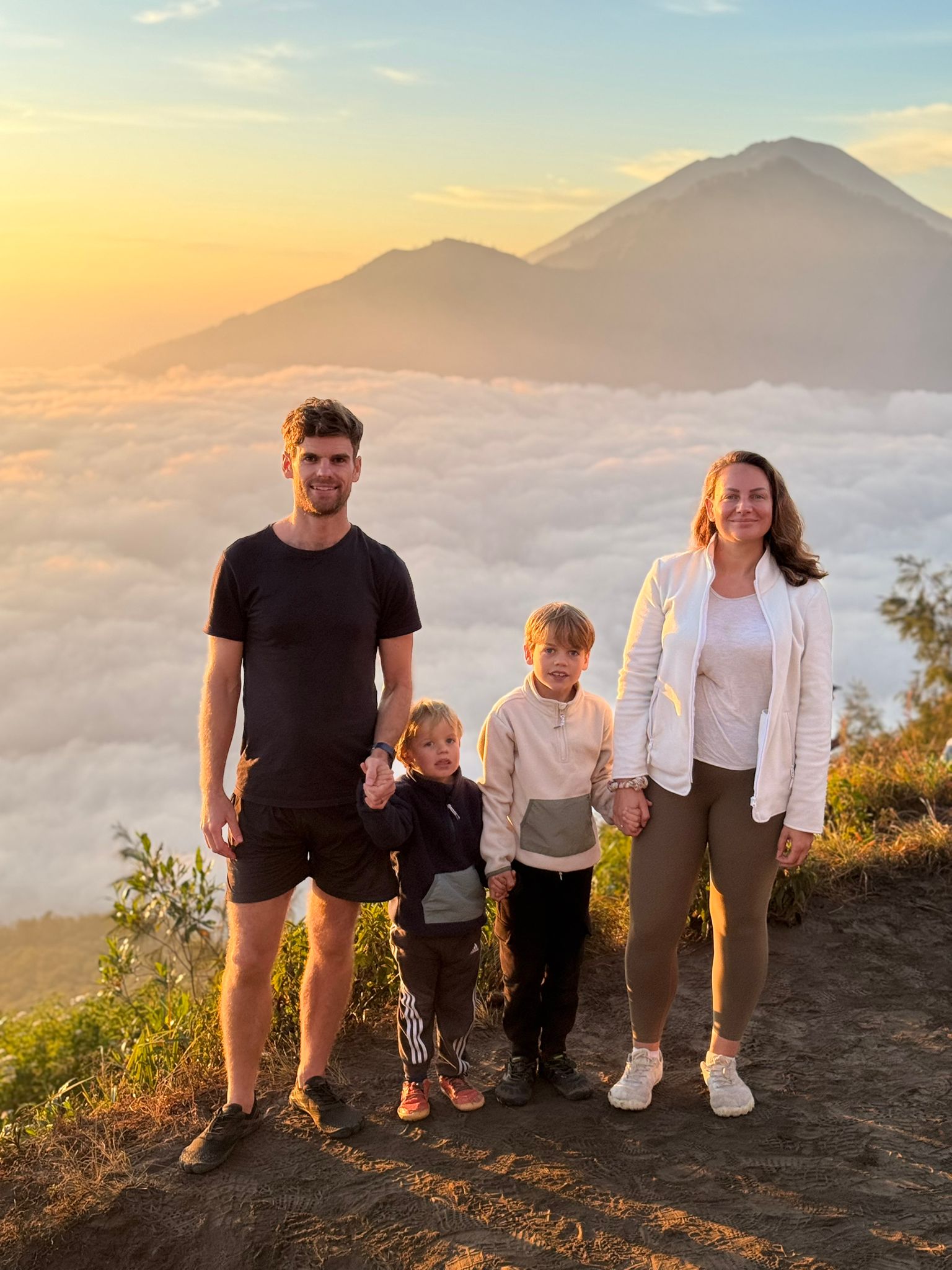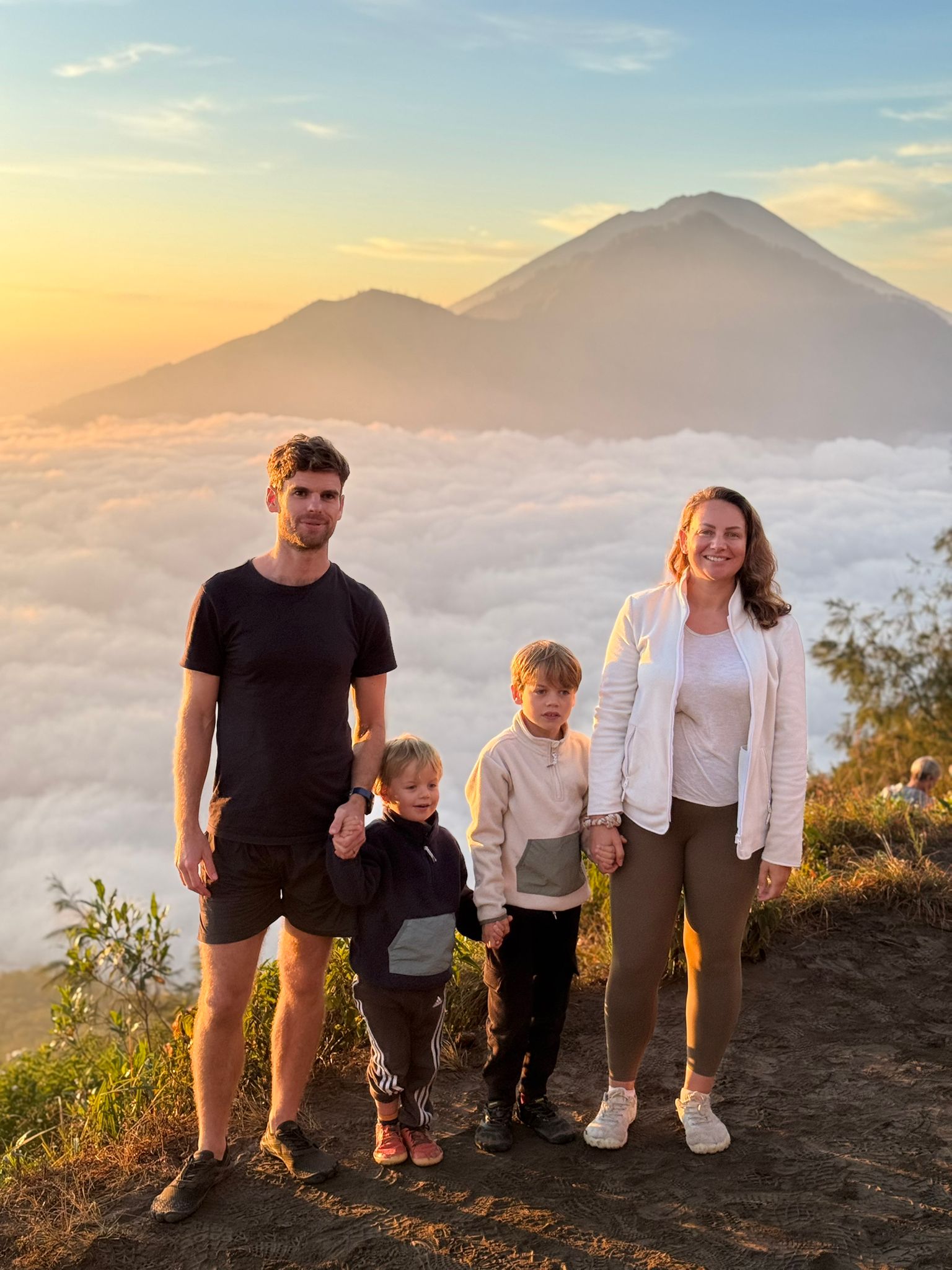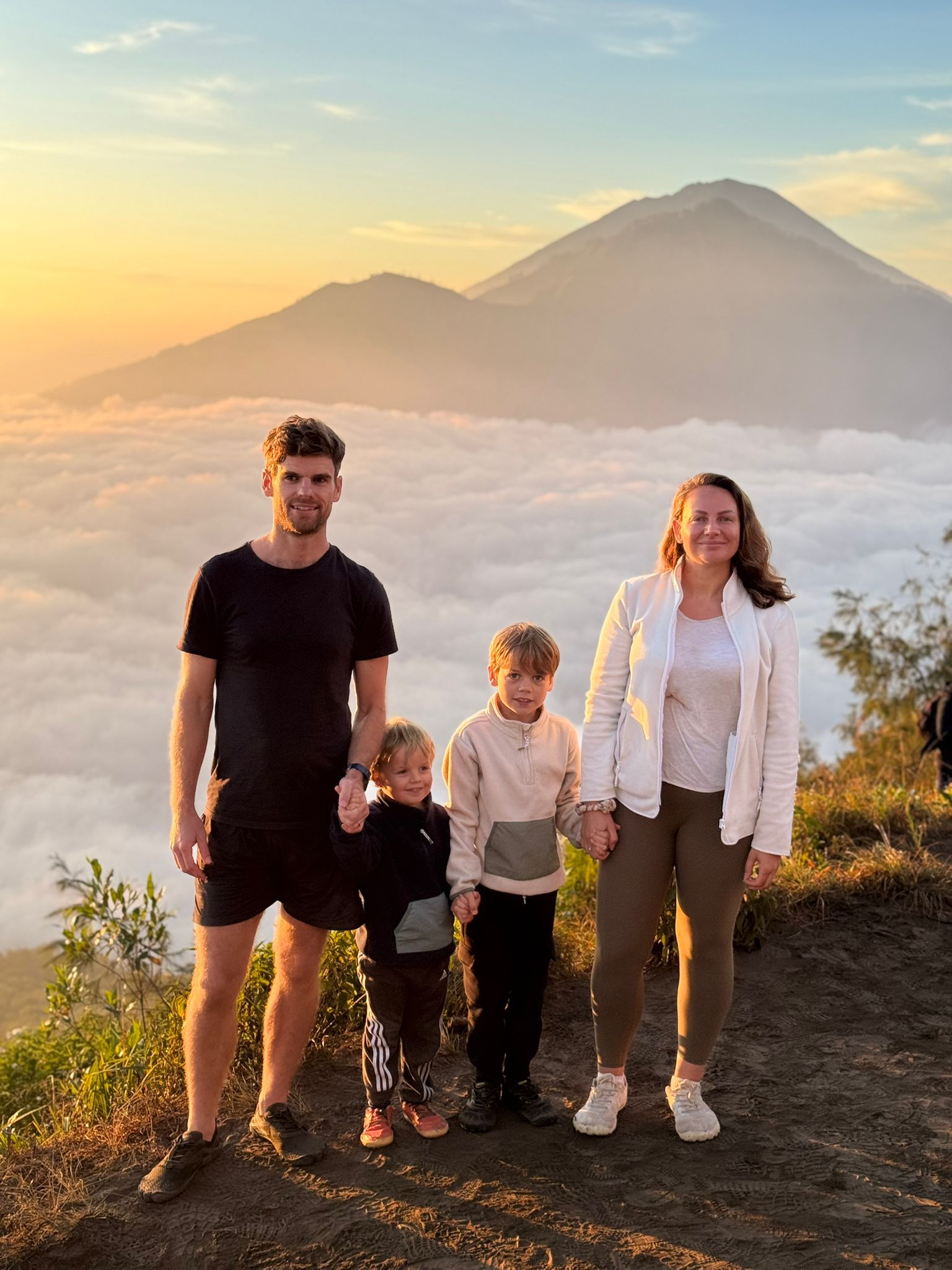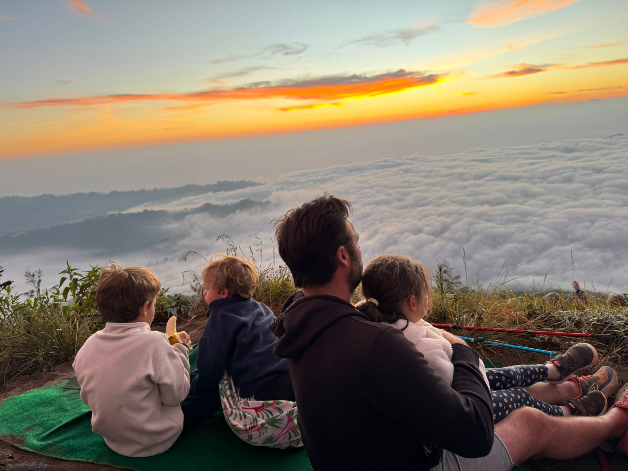 Lundi 25 Août, randonnée sur le Volcan Mount Batur tous ensemble. Départ de la maison, minuit et demi pour Marie, Mika et Jade, 1h30 pour nous. 2h de trajet, arrivée au pied du volcan à 3h30 du matin et il faisait froid (beaucoup beaucoup plus froid que dans le nord de Bali). 20 minutes de Jeep suivies d’1h30 d’ascension. J’avais convaincu Alistair que non, les tongs pour monter le volcan ce n’était pas le meilleur choix, et heureusement! Les enfants ont été super. On montait avec les lampes torches et on ne voyait presque rien. Arrivés au sommet, vue imprenable, lever du soleil magnifique, photoshoot avec le guide. Un de nos meilleurs moments à Bali. Avant de rentrer, nous nous sommes arrêtés aux sources chaudes pour un moment de détente très appréciable.
