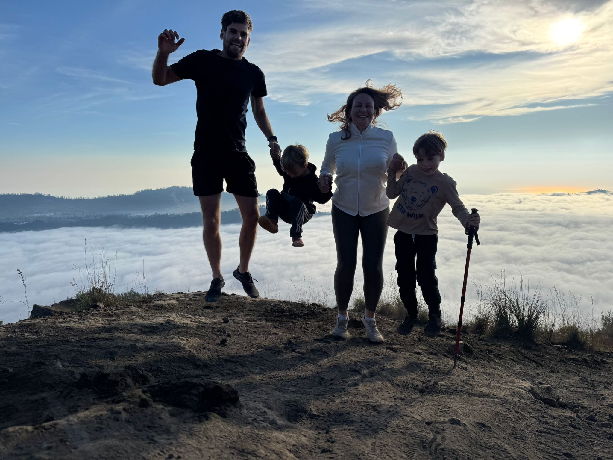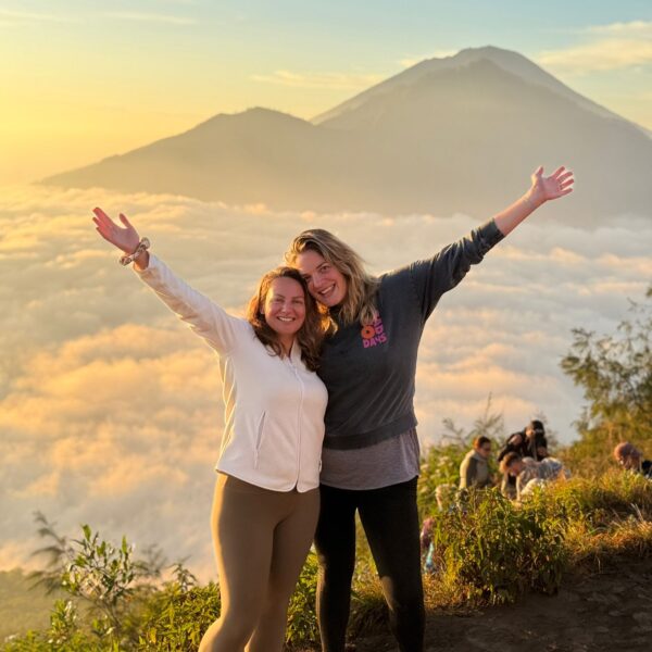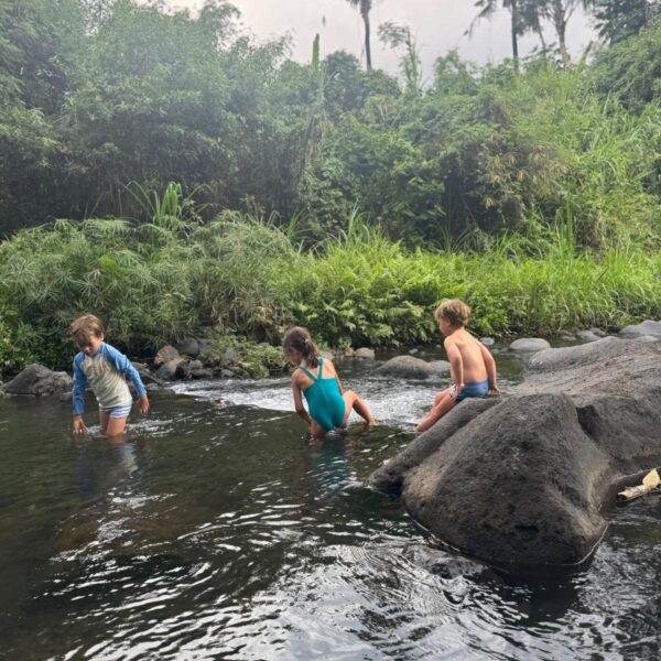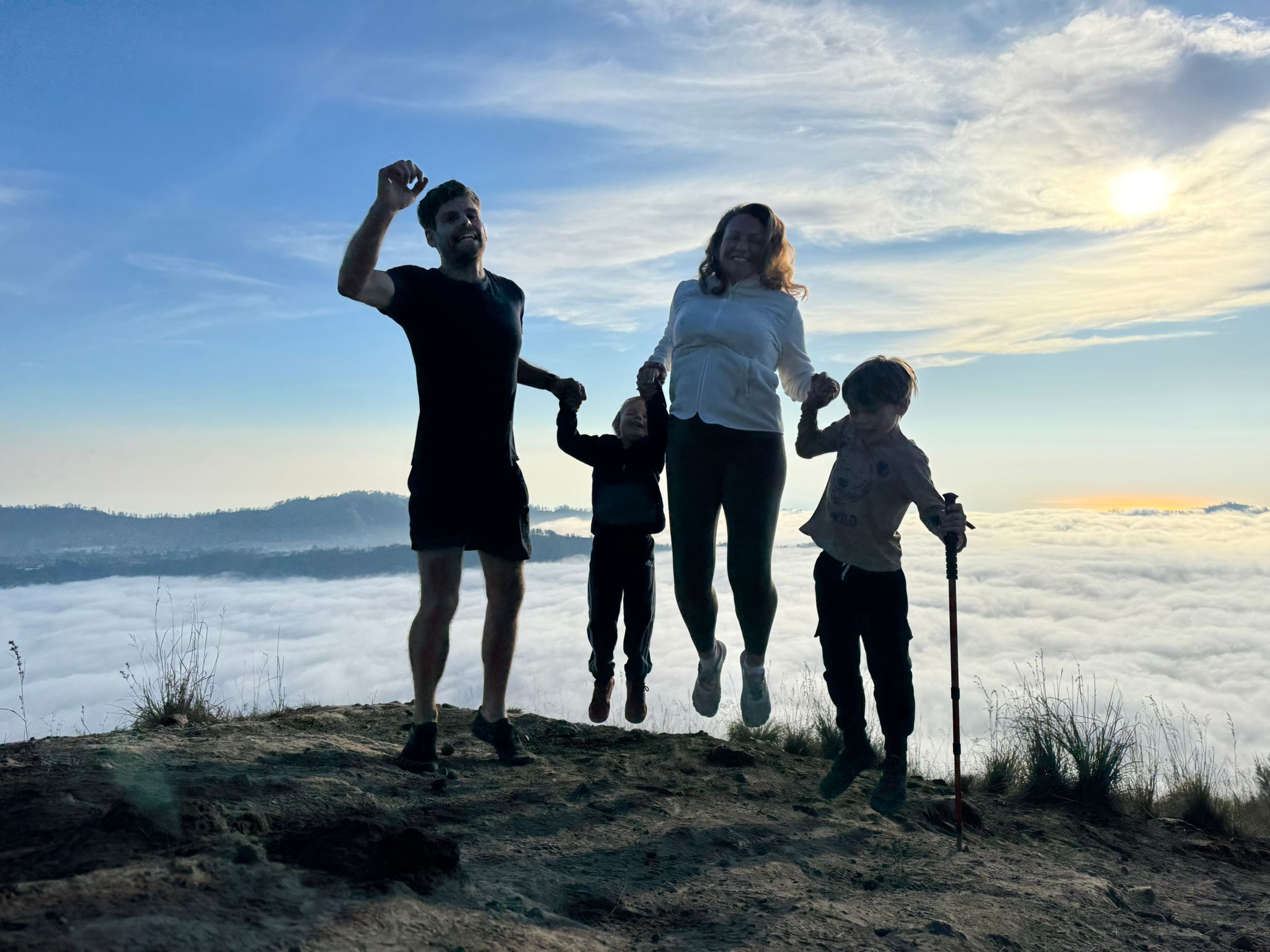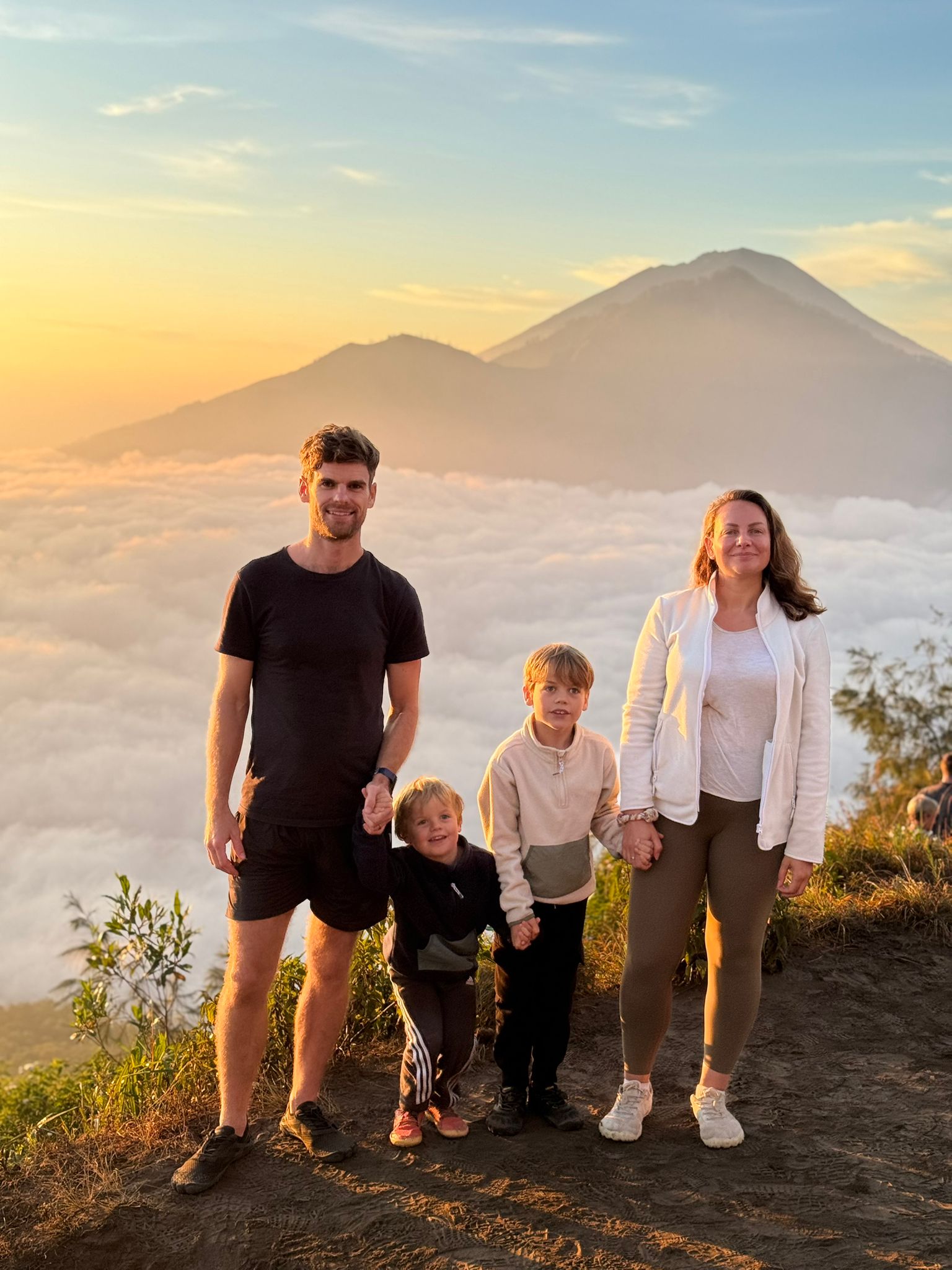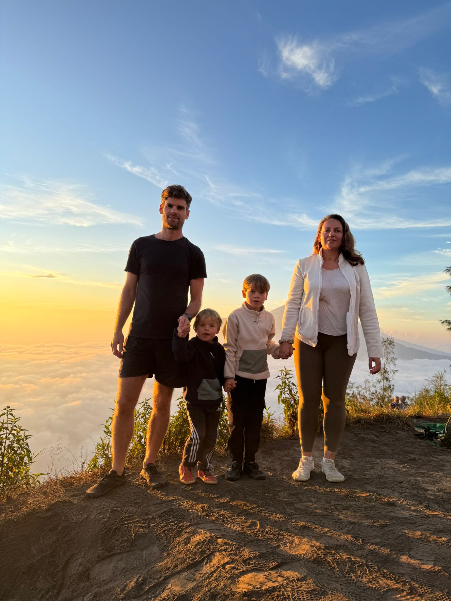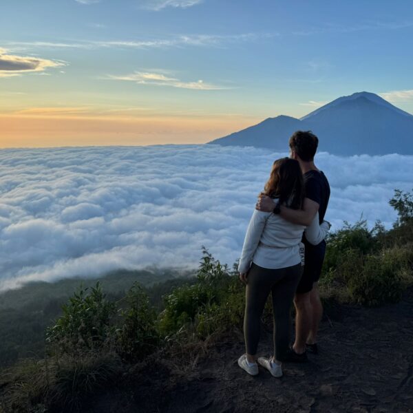 Lundi 25 Août, randonnée sur le Volcan Mount Batur tous ensemble. Départ de la maison, minuit et demi pour Marie, Mika et Jade, 1h30 pour nous. 2h de trajet, arrivée au pied du volcan à 3h30 du matin et il faisait froid (beaucoup beaucoup plus froid que dans le nord de Bali). 20 minutes de Jeep suivies d’1h30 d’ascension. J’avais convaincu Alistair que non, les tongs pour monter le volcan ce n’était pas le meilleur choix, et heureusement! Les enfants ont été super. On montait avec les lampes torches et on ne voyait presque rien. Arrivés au sommet, vue imprenable, lever du soleil magnifique, photoshoot avec le guide. Un de nos meilleurs moments à Bali. Avant de rentrer, nous nous sommes arrêtés aux sources chaudes pour un moment de détente très appréciable.