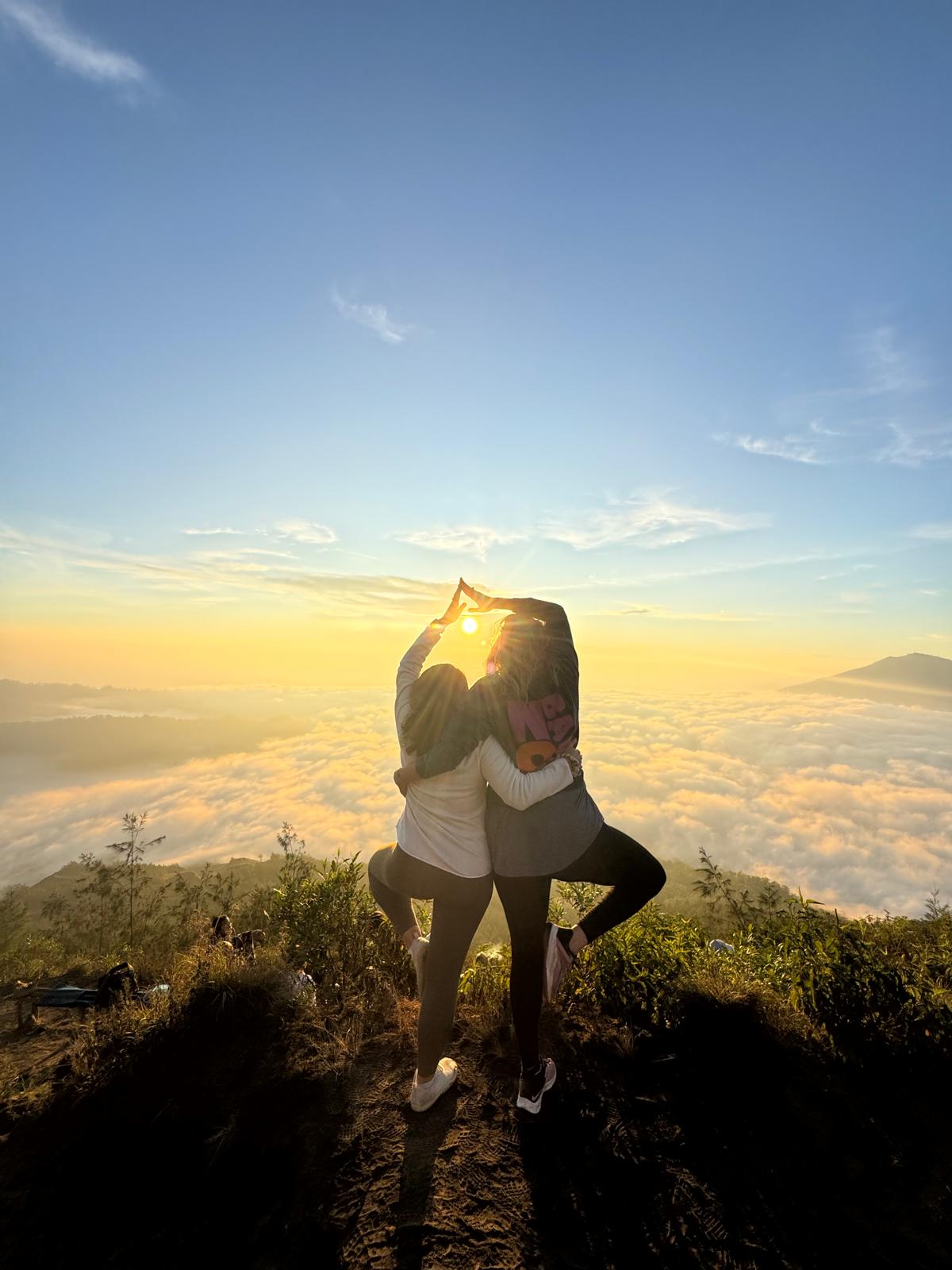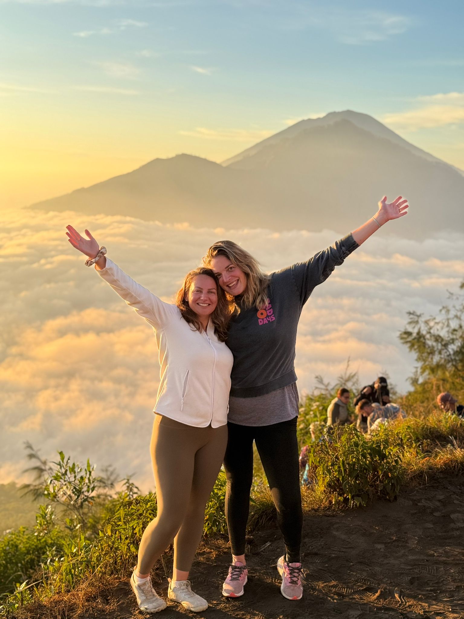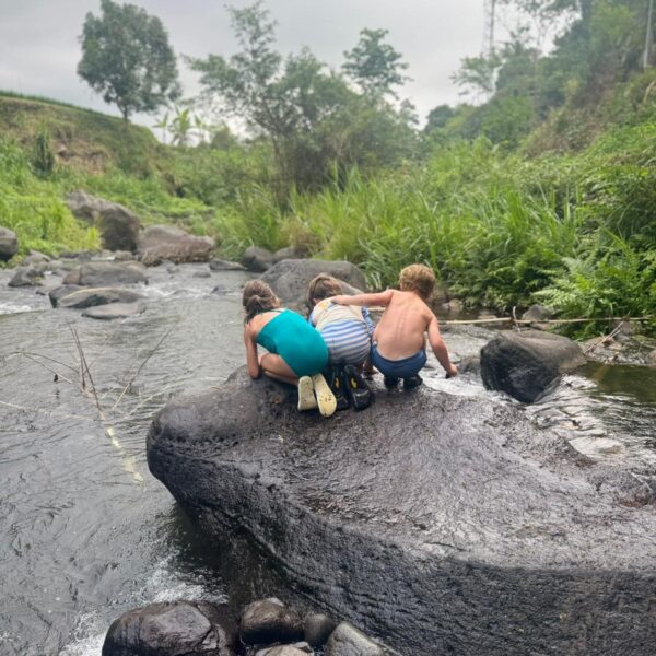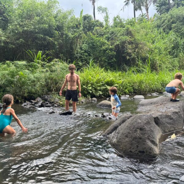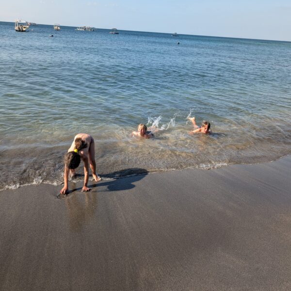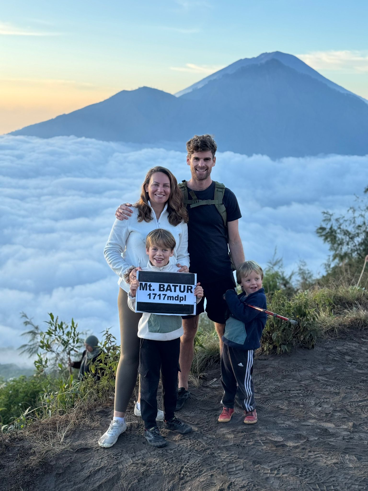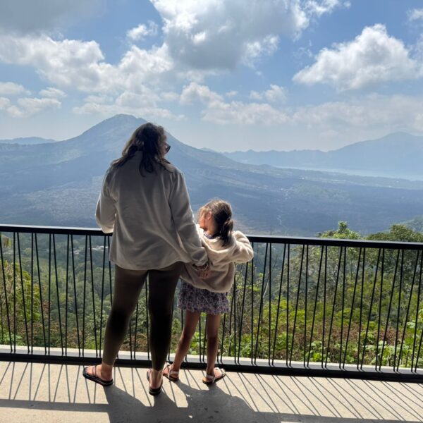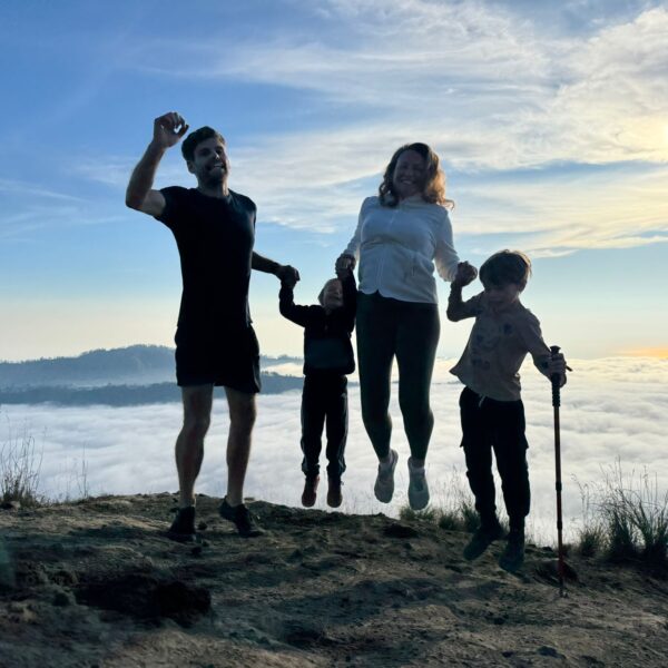 Lundi 25 Août, randonnée sur le Volcan Mount Batur tous ensemble. Départ de la maison, minuit et demi pour Marie, Mika et Jade, 1h30 pour nous. 2h de trajet, arrivée au pied du volcan à 3h30 du matin et il faisait froid (beaucoup beaucoup plus froid que dans le nord de Bali). 20 minutes de Jeep suivies d’1h30 d’ascension. J’avais convaincu Alistair que non, les tongs pour monter le volcan ce n’était pas le meilleur choix, et heureusement! Les enfants ont été super. On montait avec les lampes torches et on ne voyait presque rien. Arrivés au sommet, vue imprenable, lever du soleil magnifique, photoshoot avec le guide. Un de nos meilleurs moments à Bali. Avant de rentrer, nous nous sommes arrêtés aux sources chaudes pour un moment de détente très appréciable.