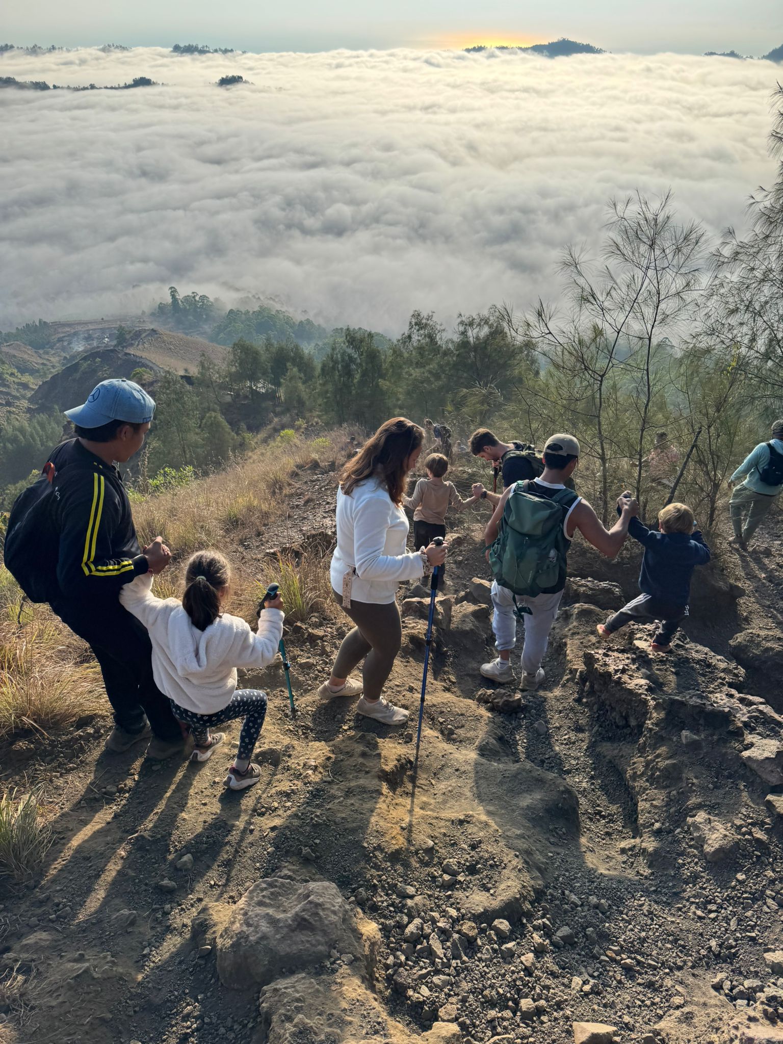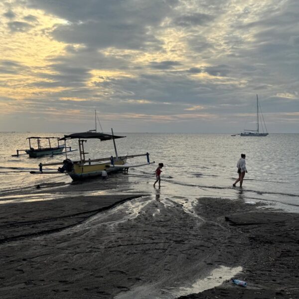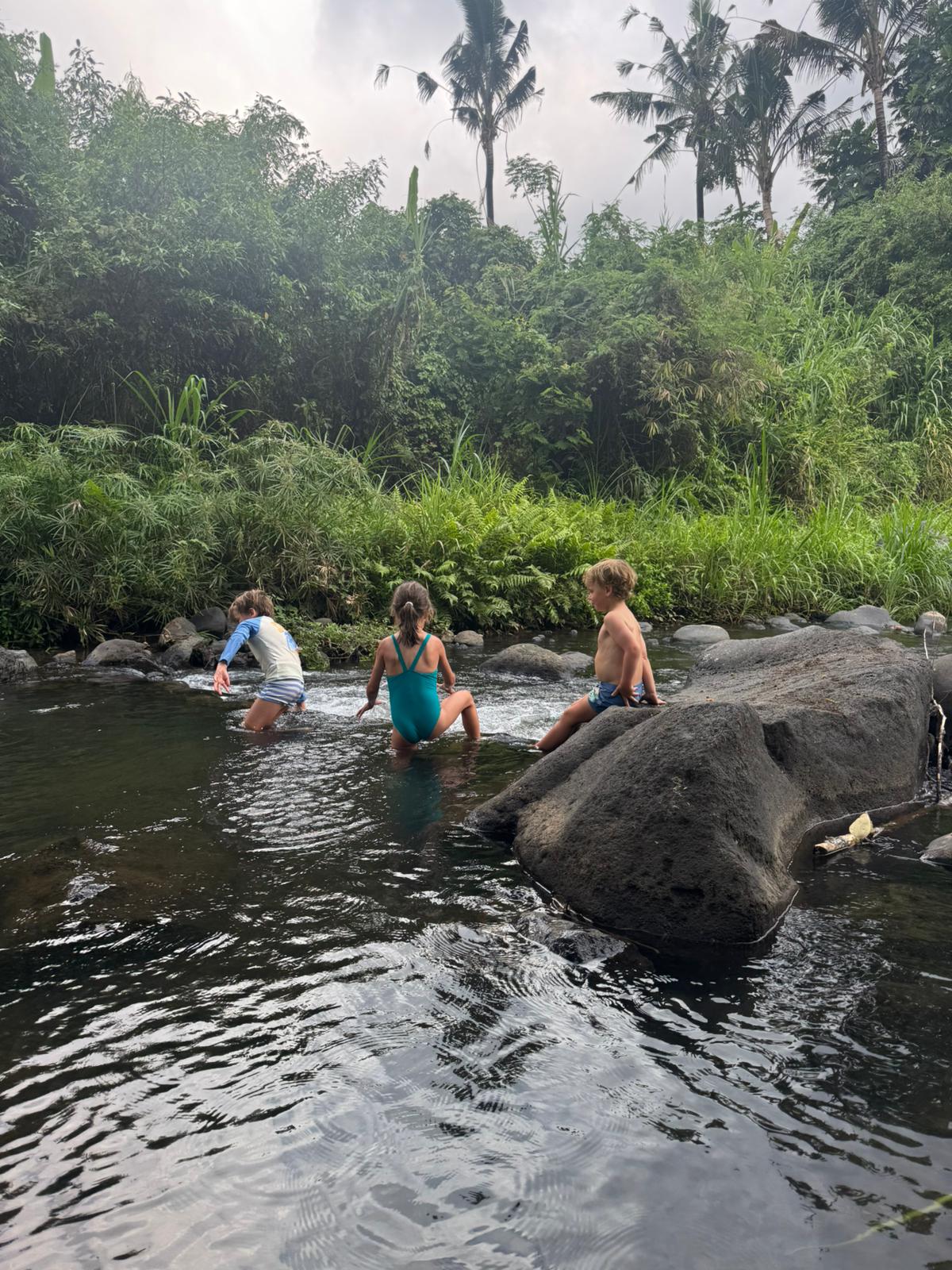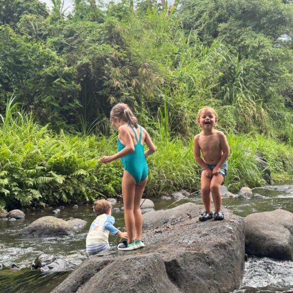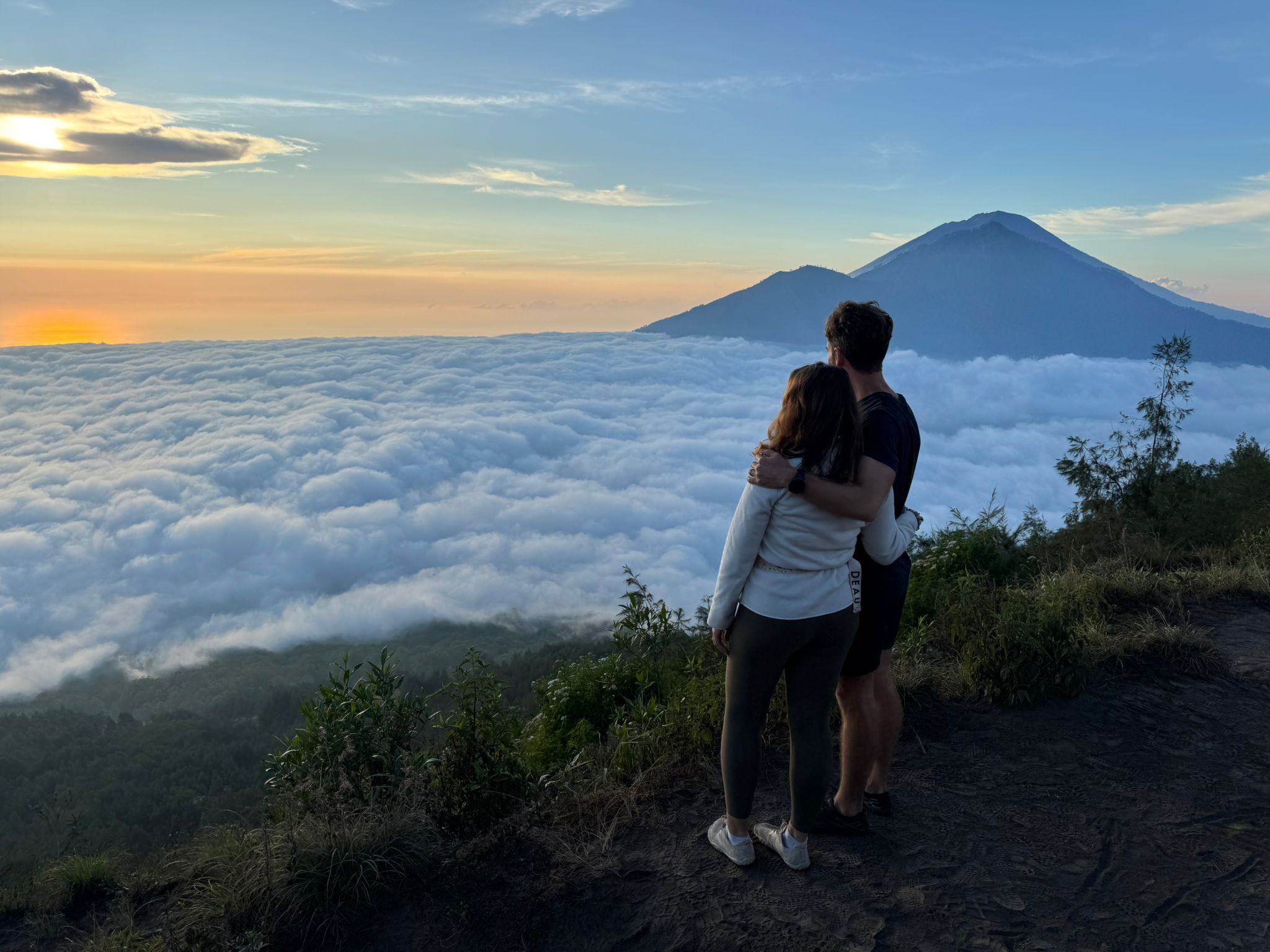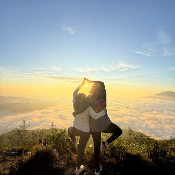 Lundi 25 Août, randonnée sur le Volcan Mount Batur tous ensemble. Départ de la maison, minuit et demi pour Marie, Mika et Jade, 1h30 pour nous. 2h de trajet, arrivée au pied du volcan à 3h30 du matin et il faisait froid (beaucoup beaucoup plus froid que dans le nord de Bali). 20 minutes de Jeep suivies d’1h30 d’ascension. J’avais convaincu Alistair que non, les tongs pour monter le volcan ce n’était pas le meilleur choix, et heureusement! Les enfants ont été super. On montait avec les lampes torches et on ne voyait presque rien. Arrivés au sommet, vue imprenable, lever du soleil magnifique, photoshoot avec le guide. Un de nos meilleurs moments à Bali. Avant de rentrer, nous nous sommes arrêtés aux sources chaudes pour un moment de détente très appréciable.