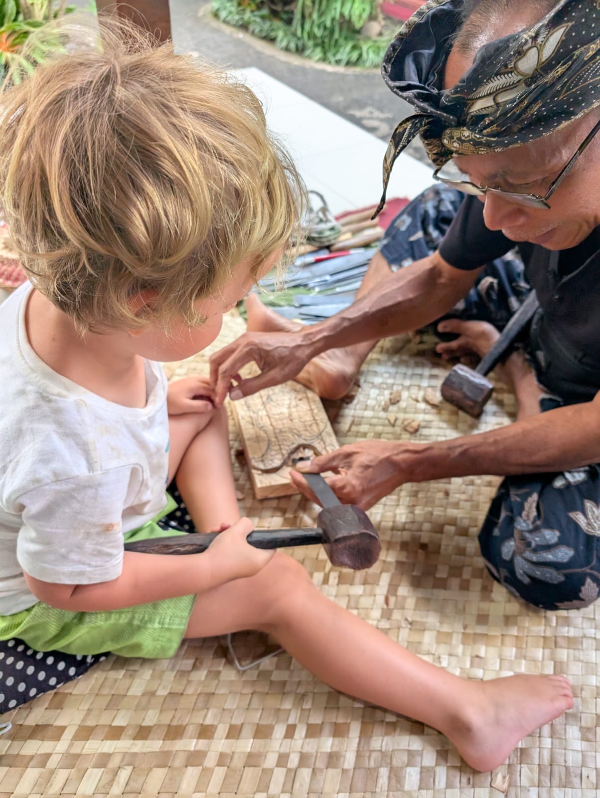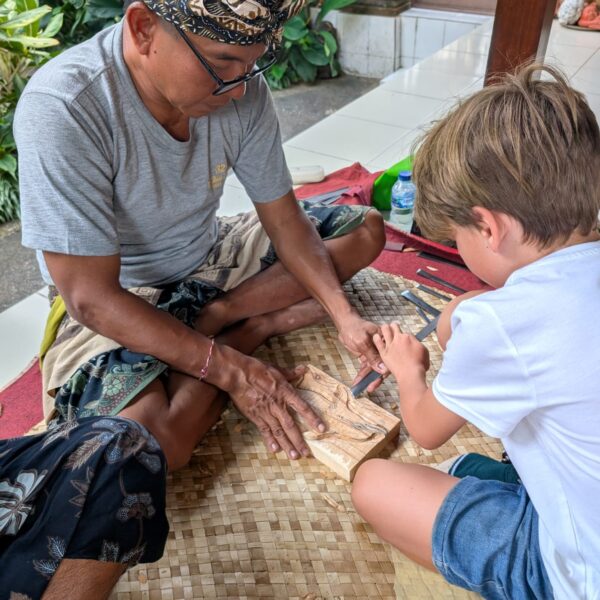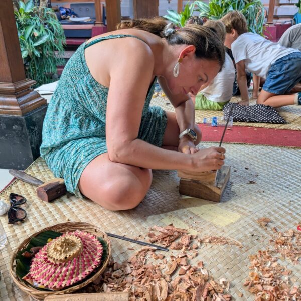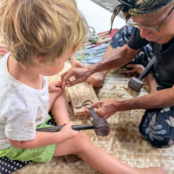 Après un déjeuner au restaurant vegan Plant Bistro (et encore une fois beaucoup trop de nourriture), Marie, Mika et Jade sont partis explorer les alentours de leur côté et notre petite famille a fait une activité sculpture sur bois. Nous avons réalisé de belles sculptures et je ne me suis tapé le doigt avec le marteau qu’une seule fois (et je me suis aussi coupée avec un outil mais le gentil Monsieur m’a mis un pansement). Alistair était hyper doué et les enfants très patients pendant les 3 heures.