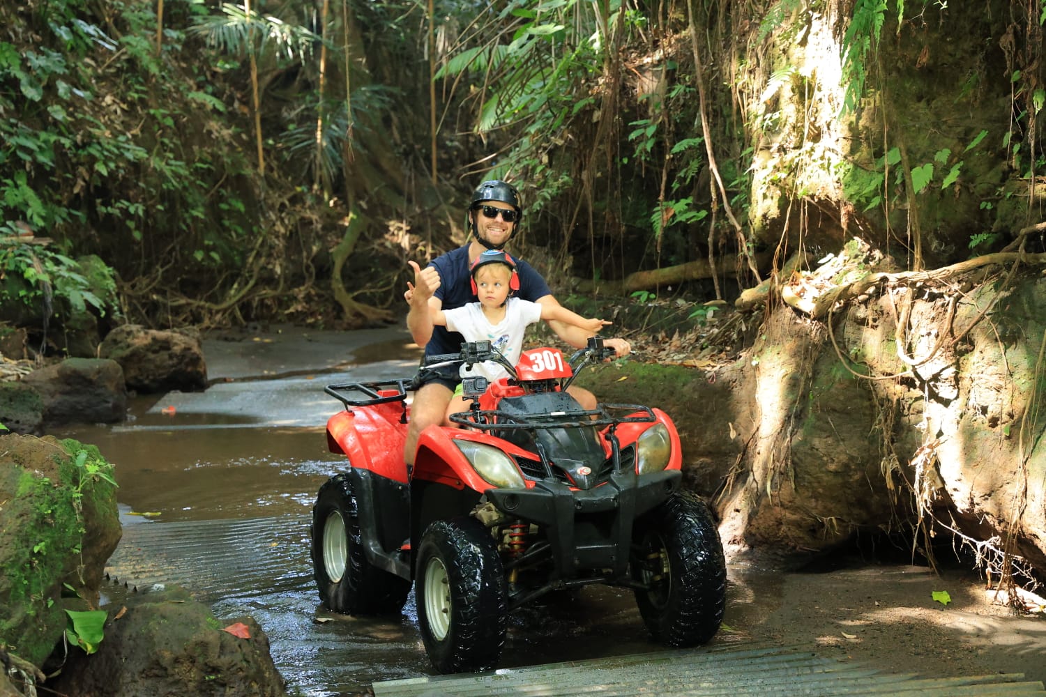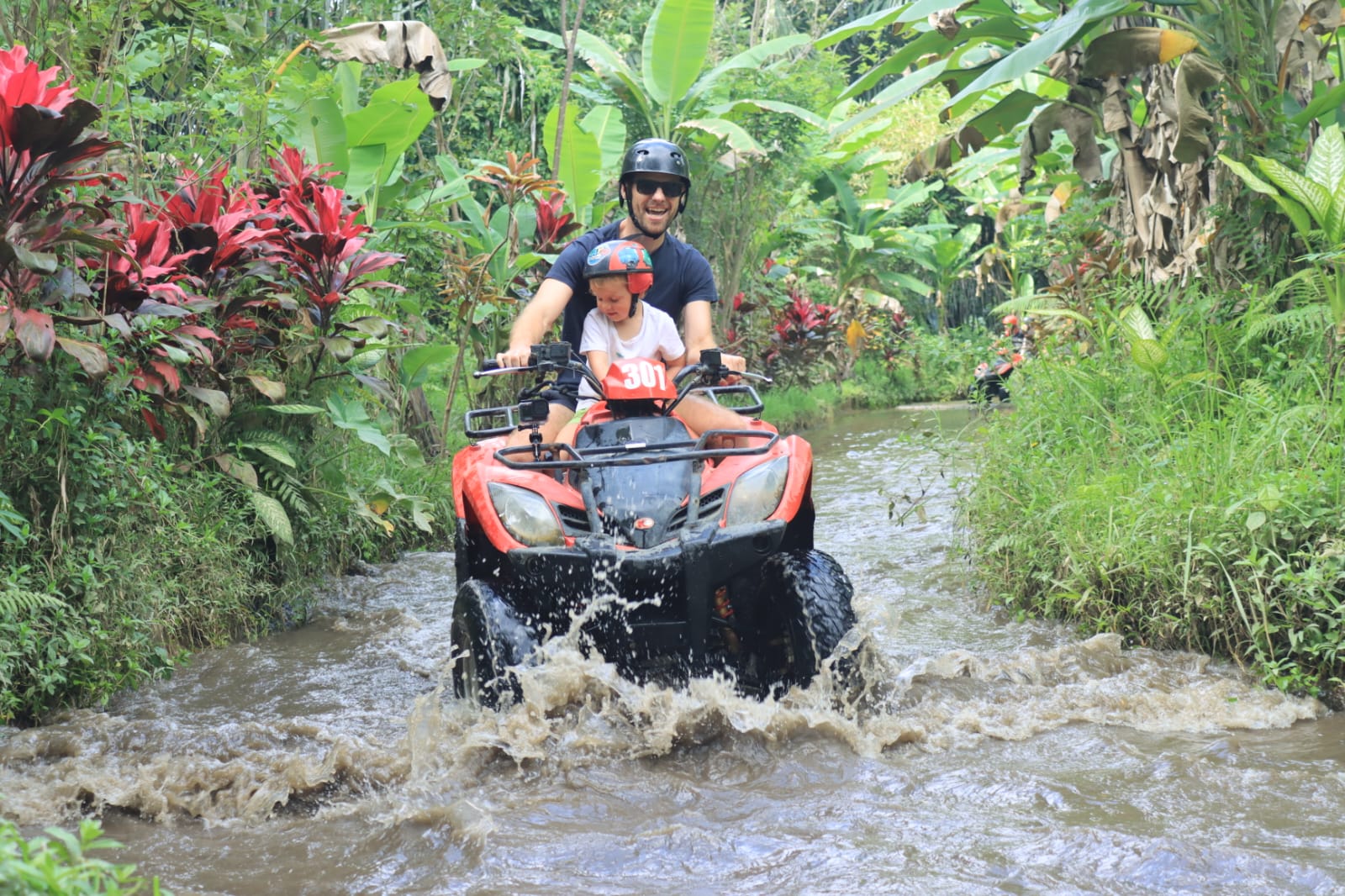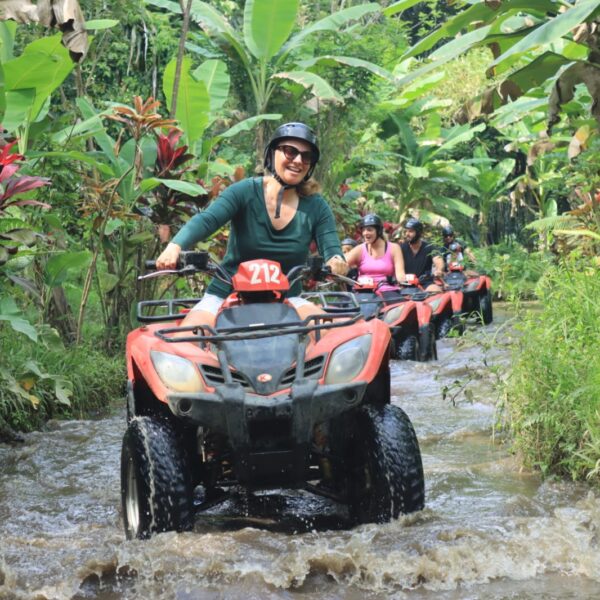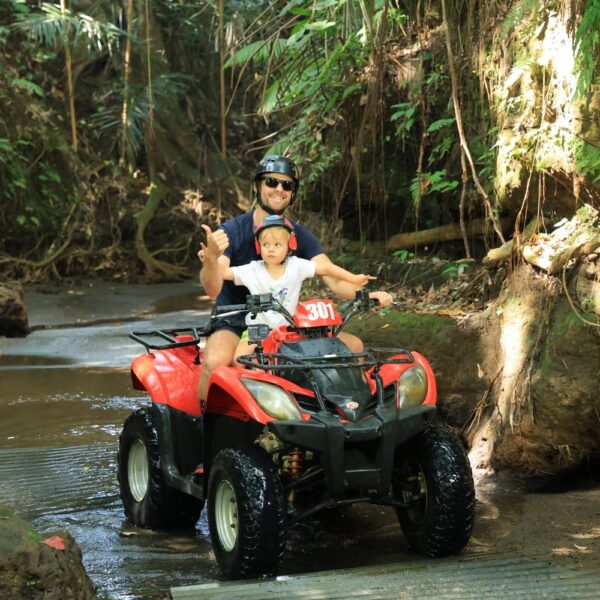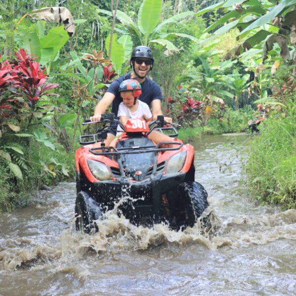 Vendredi 22 Août, journée Quad à Ubud. Nous avons eu beaucoup de difficultés à trouver un prestataire qui acceptait Lilio et notre chauffeur Budi a du nous aider. Doutant de mes capacités de pilote, j’ai quand même confié les enfants à des adultes (presque) responsables: Léonard avec Marie et Lilio avec Alistair. Passage dans l’eau, dans des tunnels, dans des rizières, sur des petits ponts, c’était super! Les enfants ont adoré et nous aussi 🙂